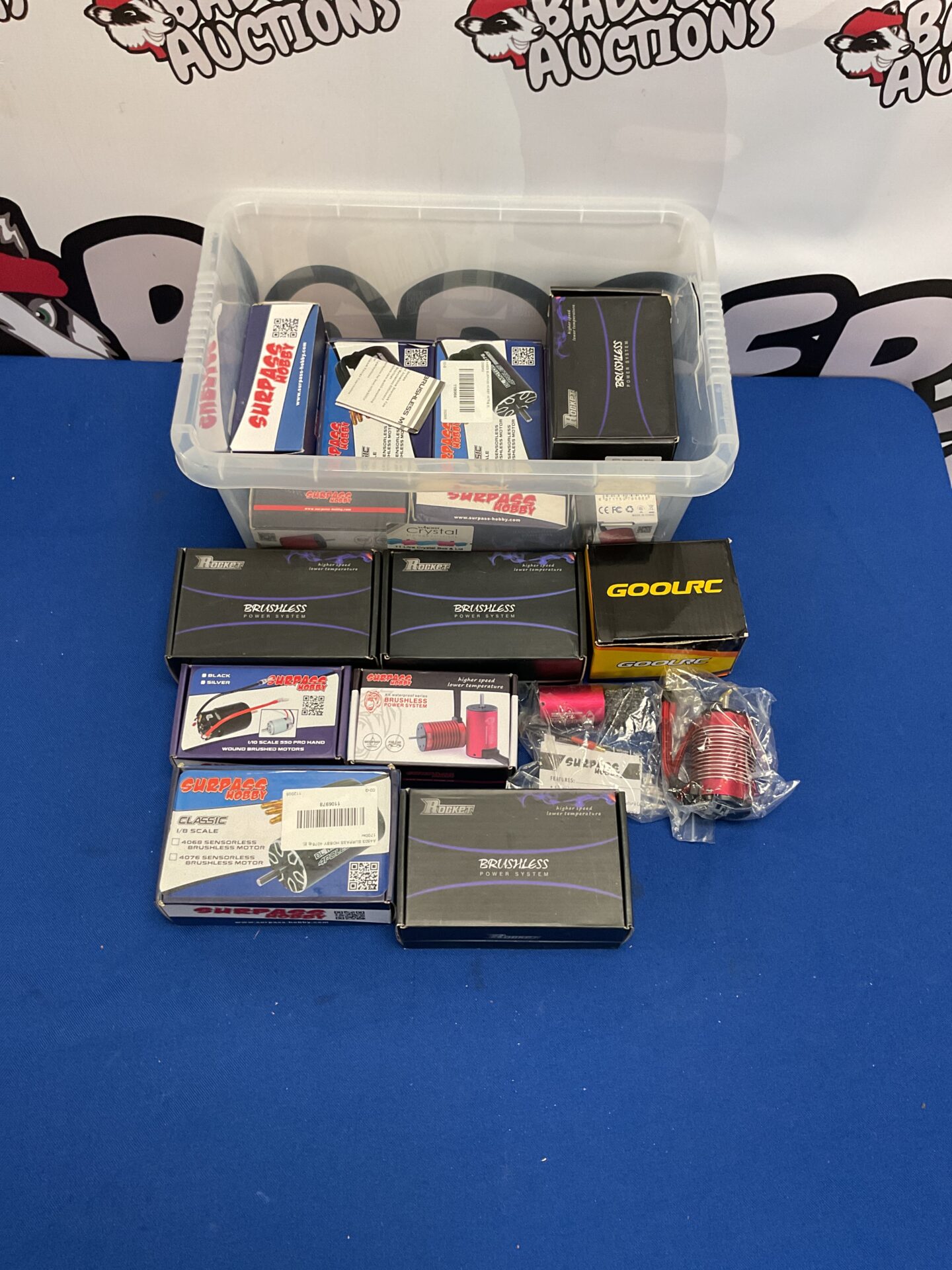 This lot contains a variety of radio control (RC) parts and accessories, seemingly geared towards cars or similar vehicles. The contents include what appears to be power systems components, potentially motors, ESCs (Electronic Speed Controllers), and other electronic parts. The assortment suggests a collection accumulated over time, offering a range of items for repairs, upgrades, or custom builds.