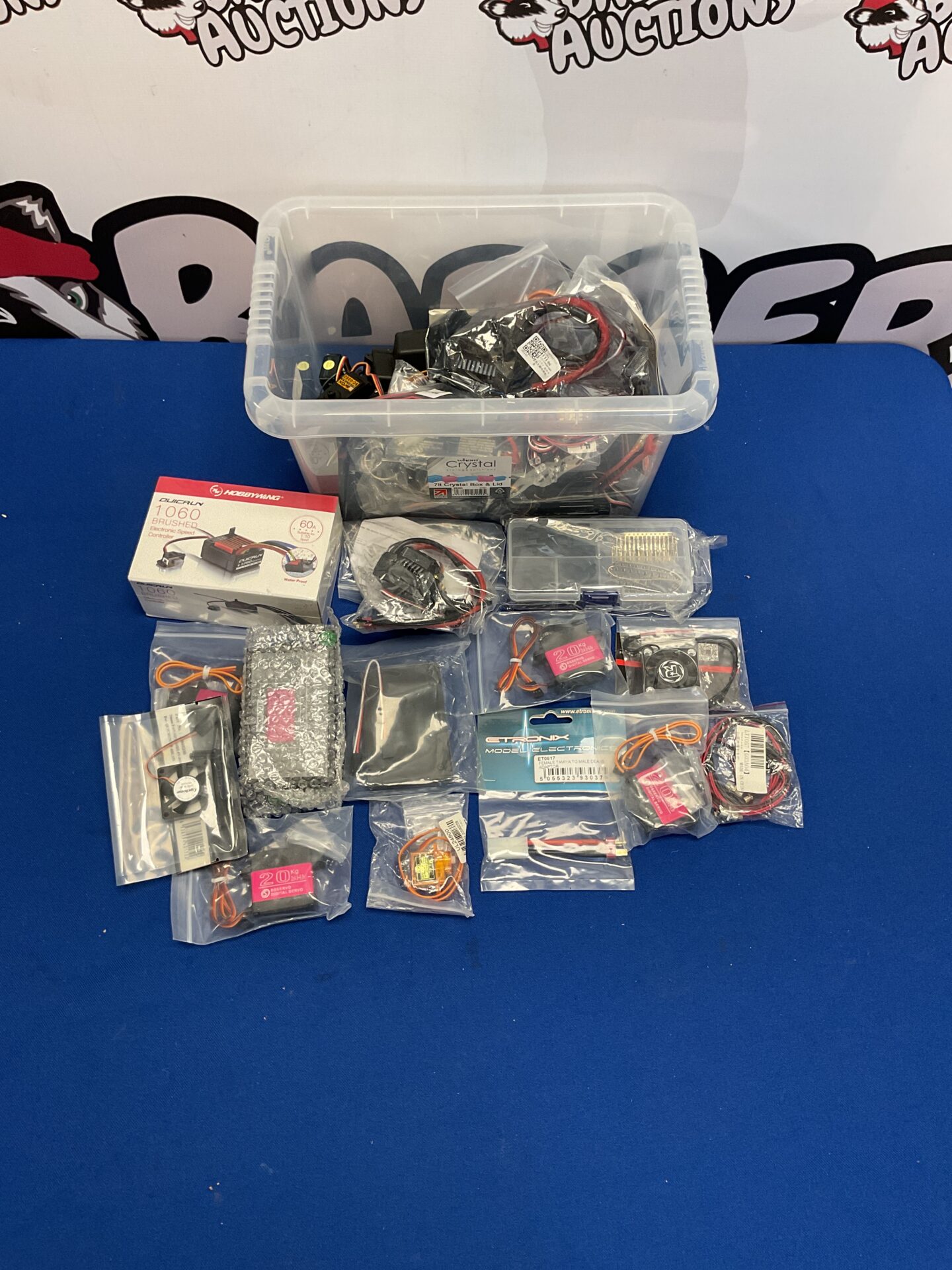 The condition of the items appears to be varied, as is typical with mixed lots. This lot presents an opportunity for hobbyists to acquire a range of parts at a potentially good value, or for collectors to find specific or rare components. The presence of a Hobbywing product adds to the appeal for those seeking reputable RC components.
