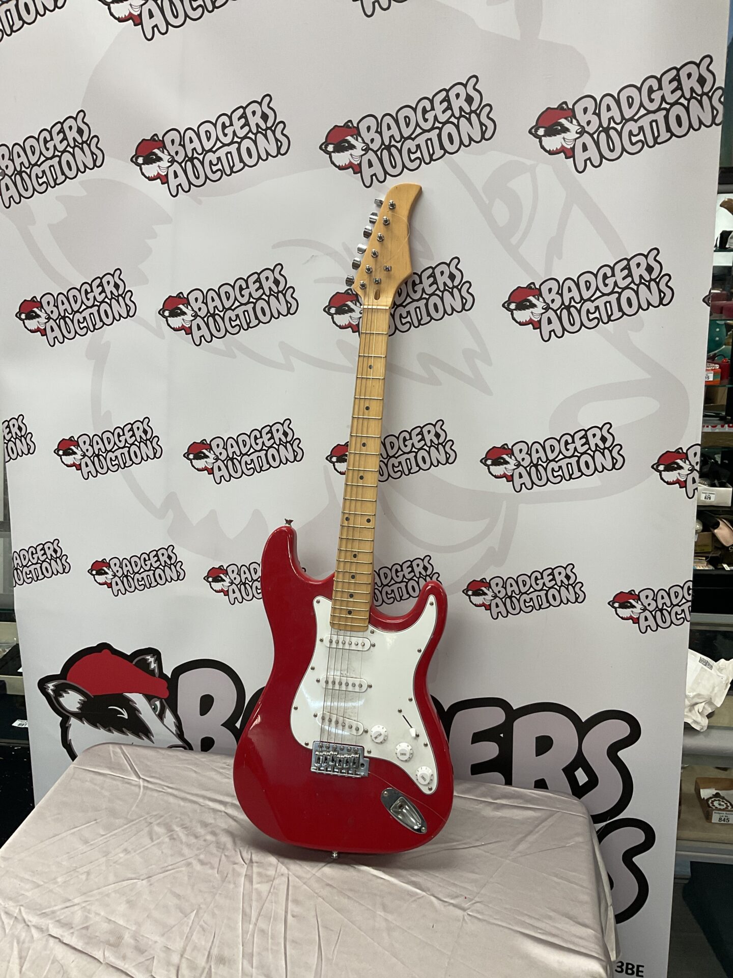 This striking red electric guitar is a visually appealing instrument, perfect for both performance and display. While the specific make and model are not immediately apparent from the visual inspection, it features a classic body shape reminiscent of popular designs. The guitar boasts a glossy red finish, a maple neck, and chrome hardware, contributing to its overall aesthetic appeal. It’s equipped with humbucker pickups, suggesting a powerful and versatile sound suitable for various musical genres.