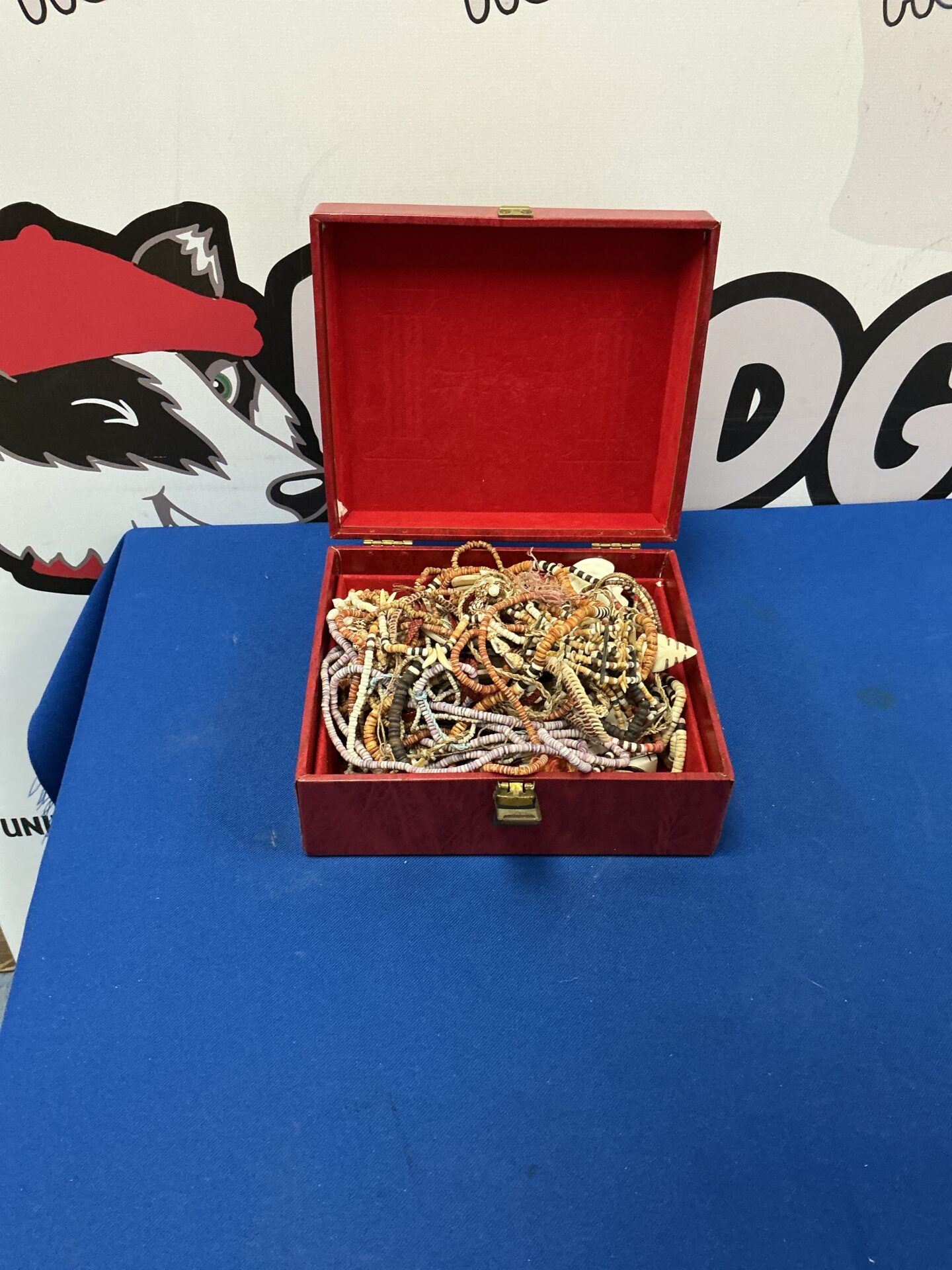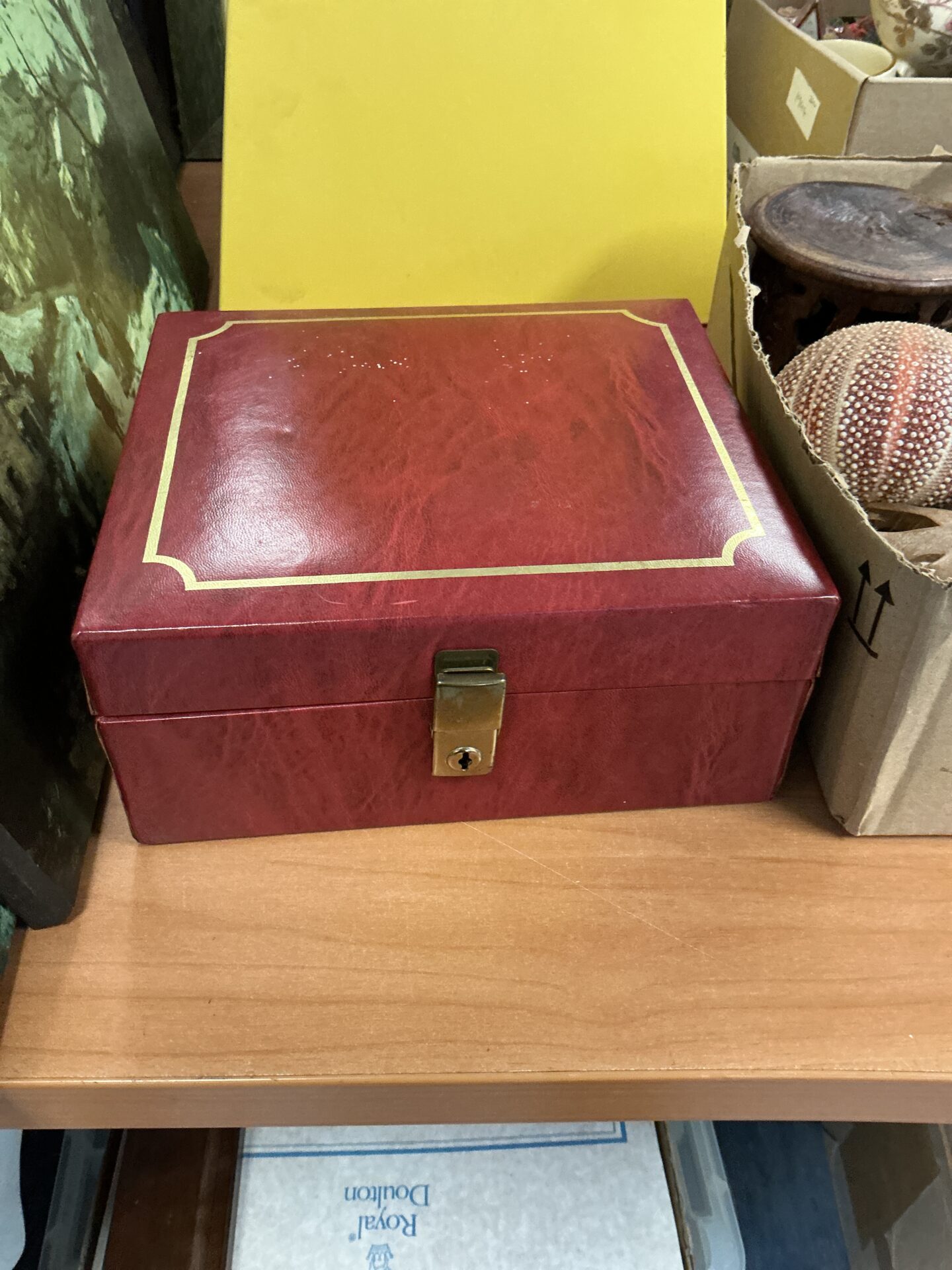 This is a charming red leather jewellery box, ideal for storing and displaying treasured pieces. The box features a classic design with a secure clasp closure. Inside, it is lined with a soft material and currently contains a collection of beaded necklaces and bracelets, adding to its vintage appeal.