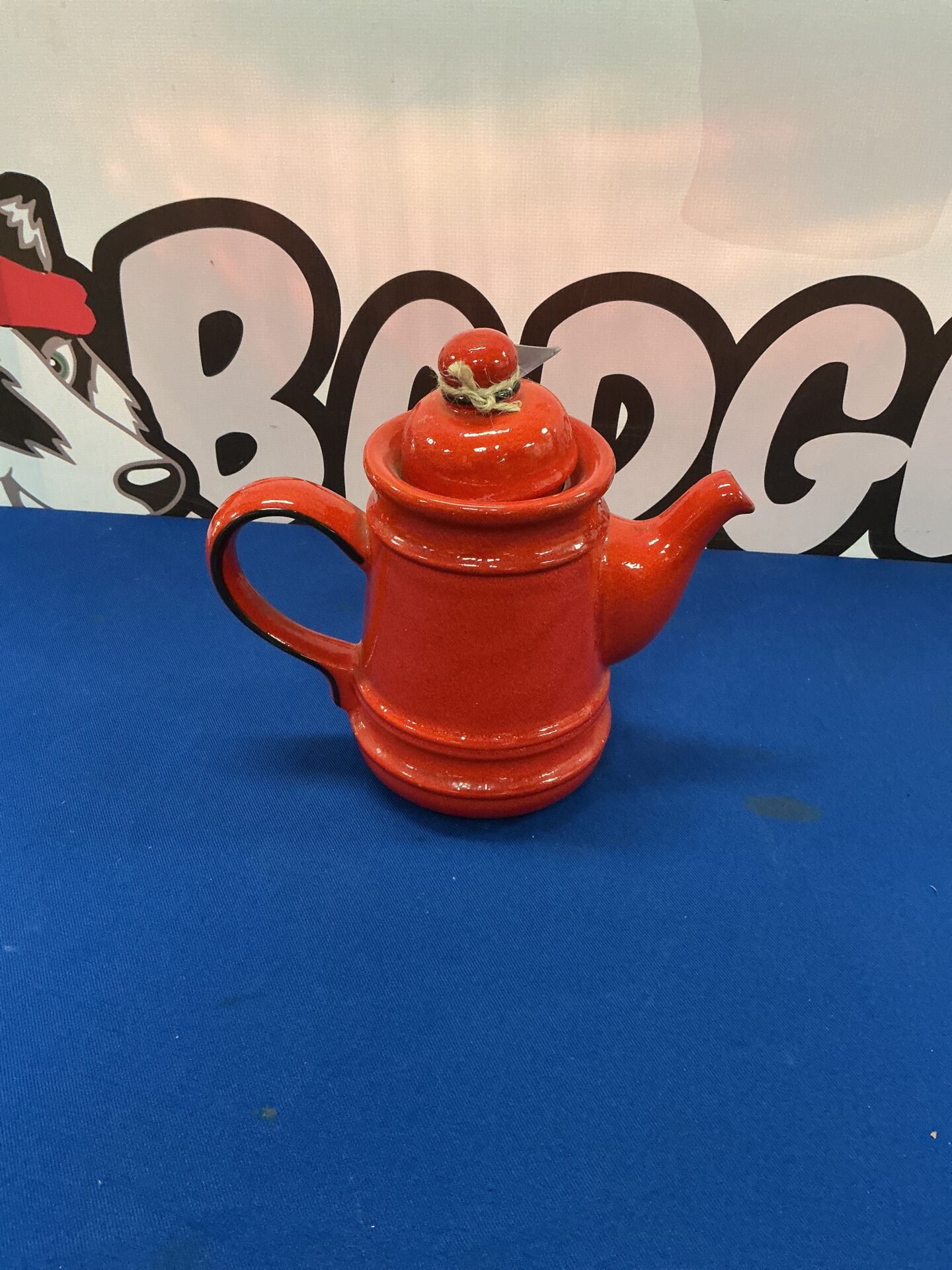 This is a vibrant red pottery teapot, likely intended for decorative use or light service. The teapot features a classic shape with a curved spout and handle, and a simple, unadorned design. The pottery appears to be stoneware, giving it a robust and earthy feel. It would make a charming addition to a farmhouse-style kitchen or a collector’s display.