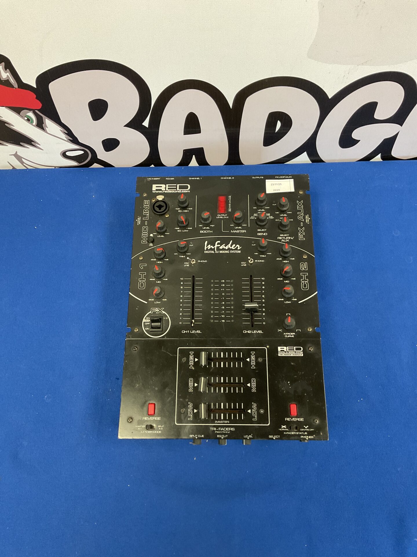 The REDSound Infader is a digital DJ mixing system designed for professional and enthusiast use. This unit features a robust build and a layout intended for seamless mixing and control. It appears to offer multiple channels and comprehensive audio routing capabilities, making it suitable for a variety of performance and recording scenarios.