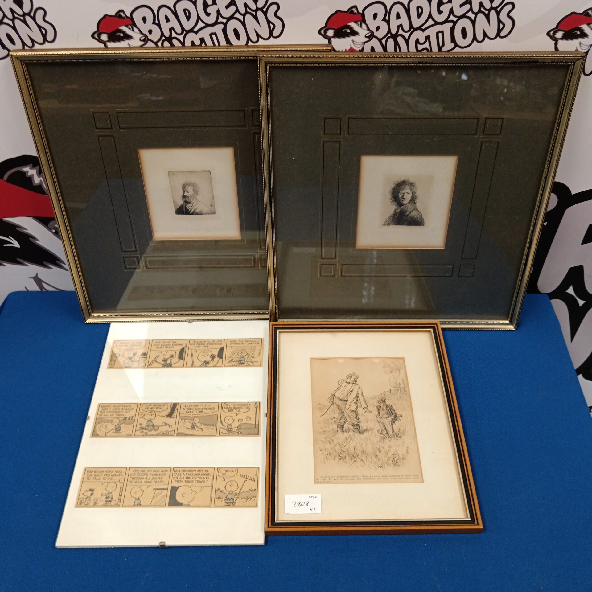 732 Pair Of Portrait Etchings After Rembrandt, Hunting Print & Snoopy Cartoon Print