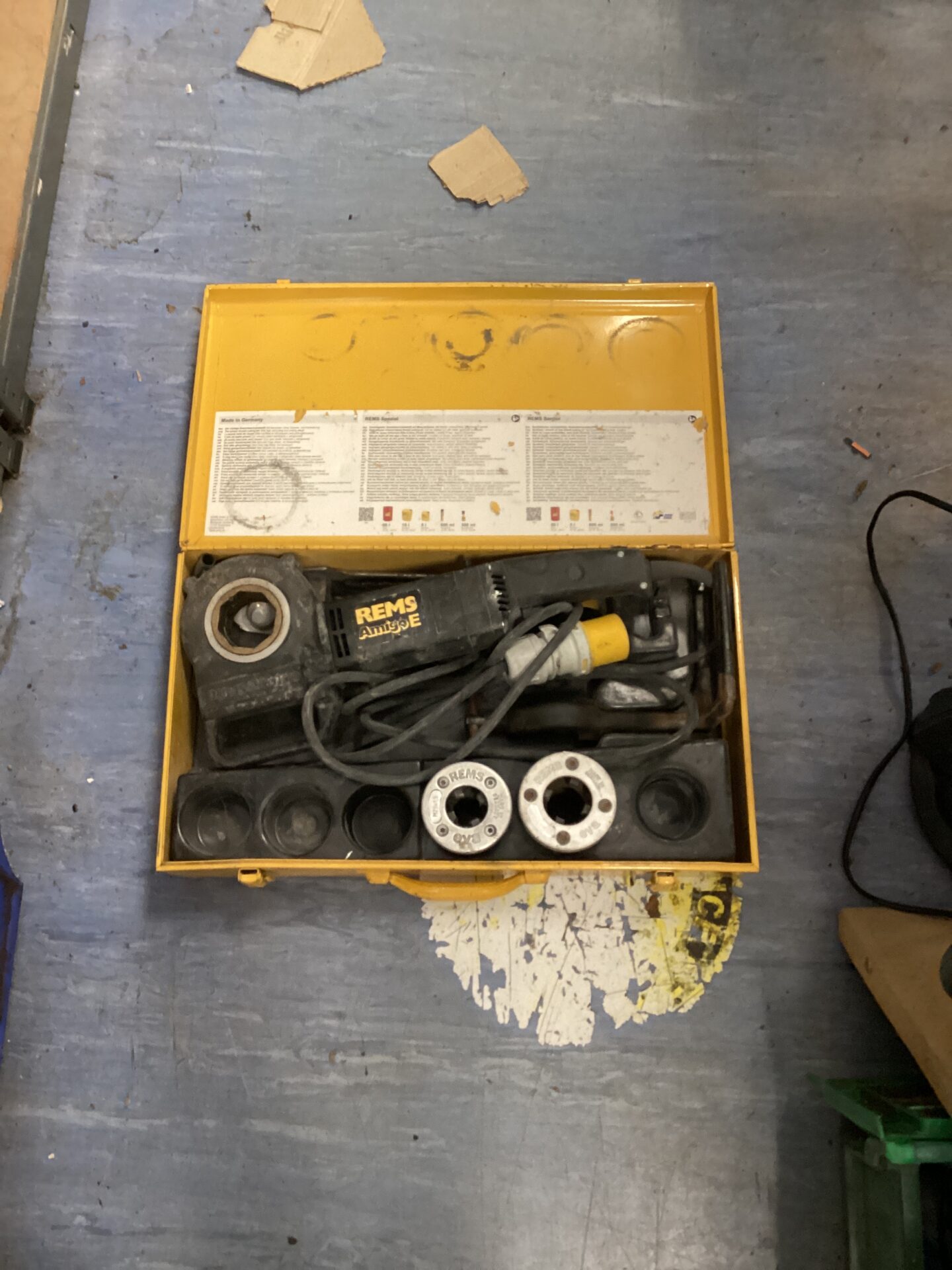 This is a Rems Amigo 110v thread cutting tool, designed for creating threaded connections on metal pipes. The tool appears to be a portable, self-opening model, intended for use by plumbers and metalworkers. It features a robust construction and is designed to provide accurate and efficient threading.