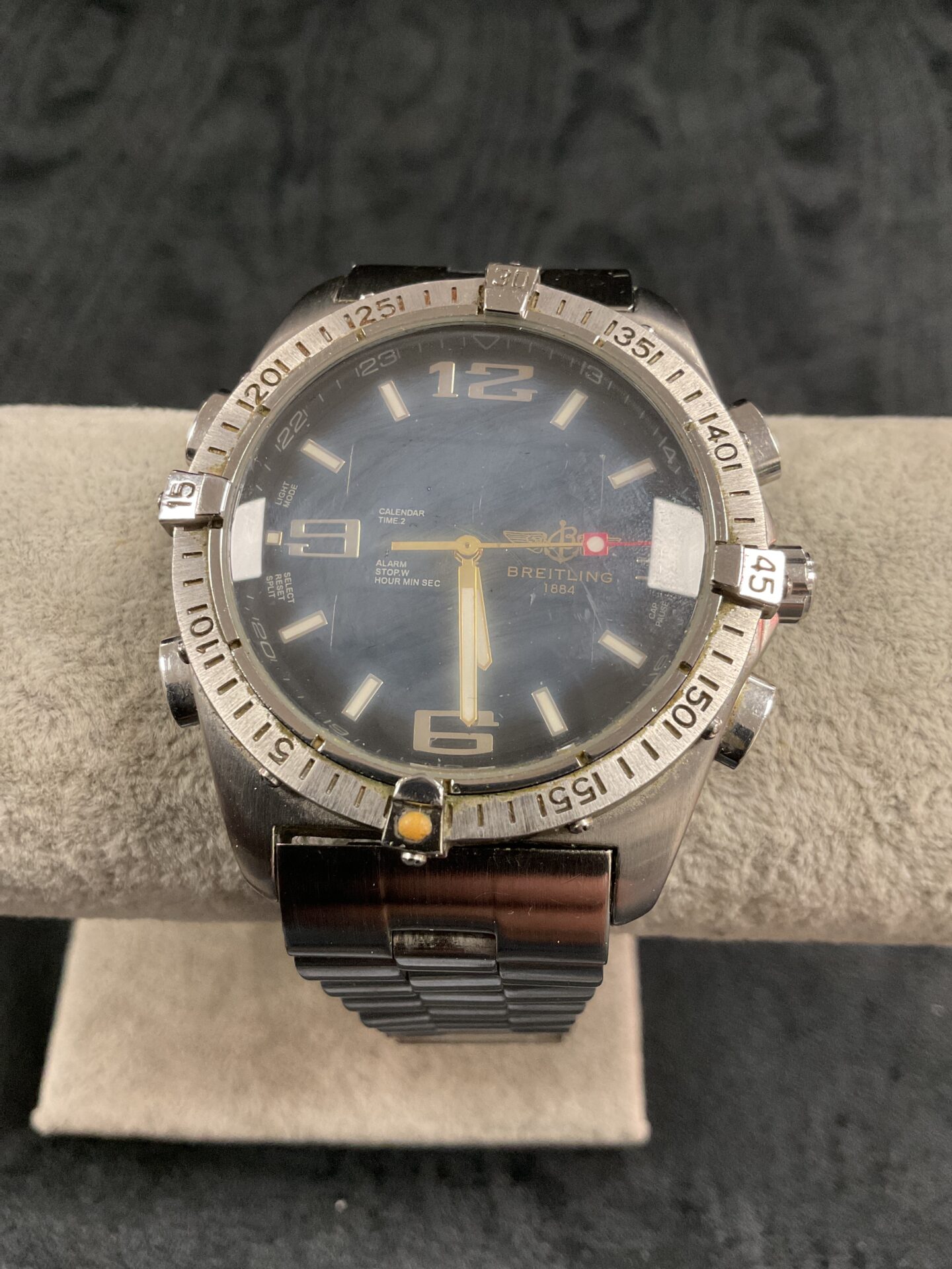 This is a replica gents quartz wristwatch, featuring a round stainless steel case and bracelet. The dial is black with white hour markers and hands. It has a date window at the 3 o’clock position. The watch is designed with a rotating bezel, adding to its sporty aesthetic.
