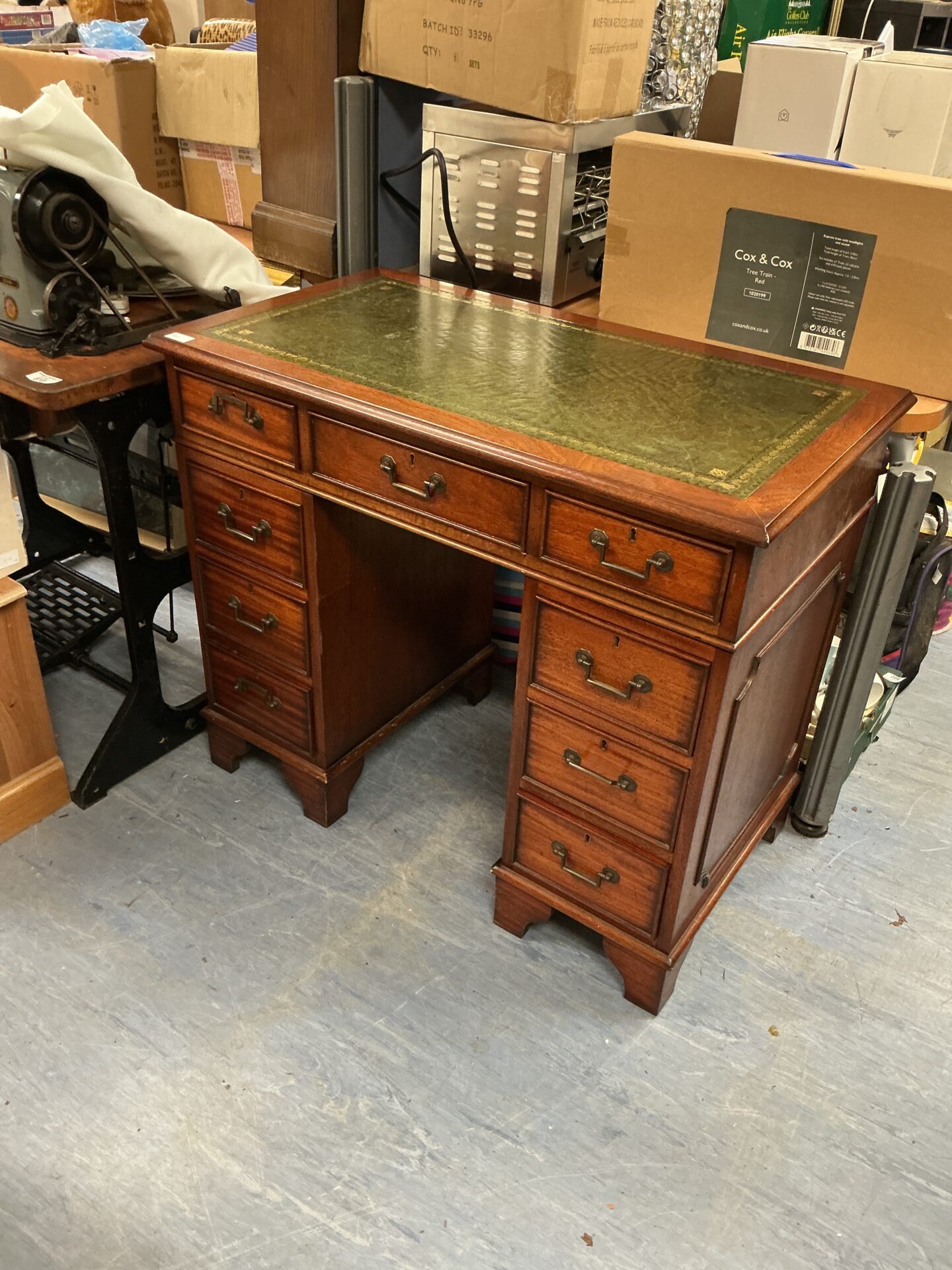 This is a reproduction leather-topped desk, measuring 36”x20”x32”. The desk features a classic design with a green leather writing surface and a wooden frame. It offers a compact workspace suitable for a home office or study, and its style evokes a traditional aesthetic.
