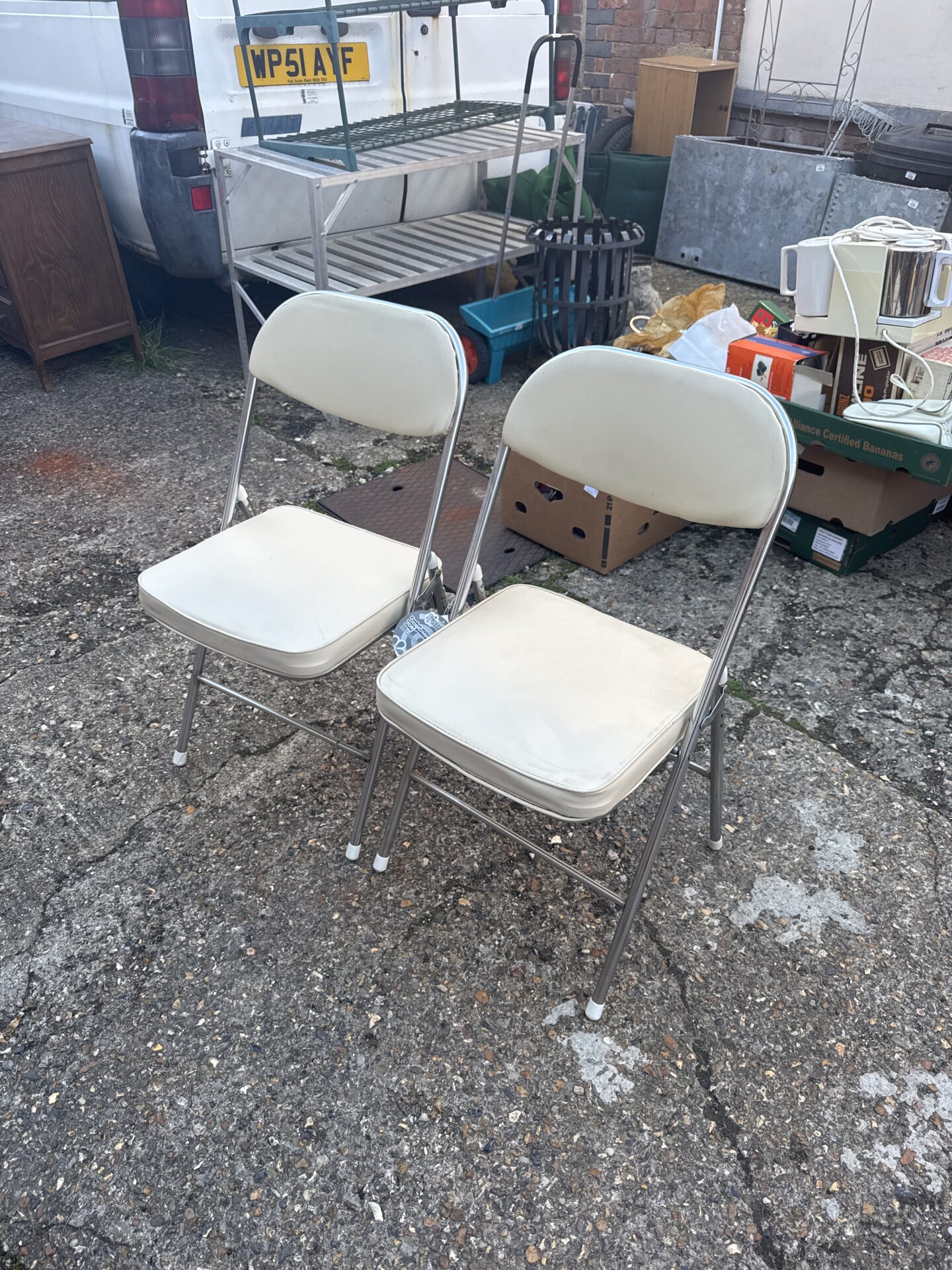 This pair of folding chairs embodies a fun, retro aesthetic, likely originating from the 1970s. Featuring padded vinyl seats and chrome frames, these chairs offer both comfort and a stylish mid-century modern look. Their folding design makes them incredibly practical for extra seating or easy storage, perfect for smaller spaces or occasional use.