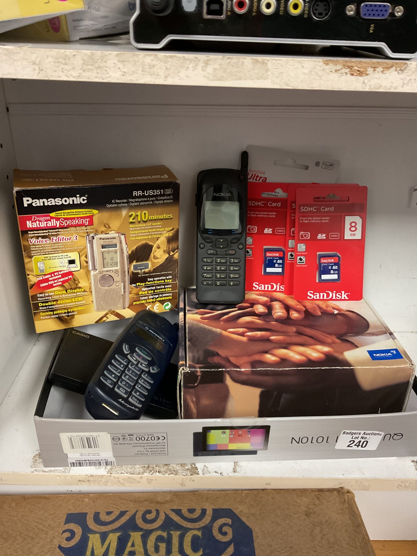 The condition of these items varies, and no functionality is guaranteed. The phones and dictaphone show signs of age and previous use, with potential cosmetic wear. This lot will appeal to collectors of vintage technology, enthusiasts of mobile phone history, or those seeking unique display pieces. The inclusion of new SD cards adds an interesting element, representing the transition to digital storage.