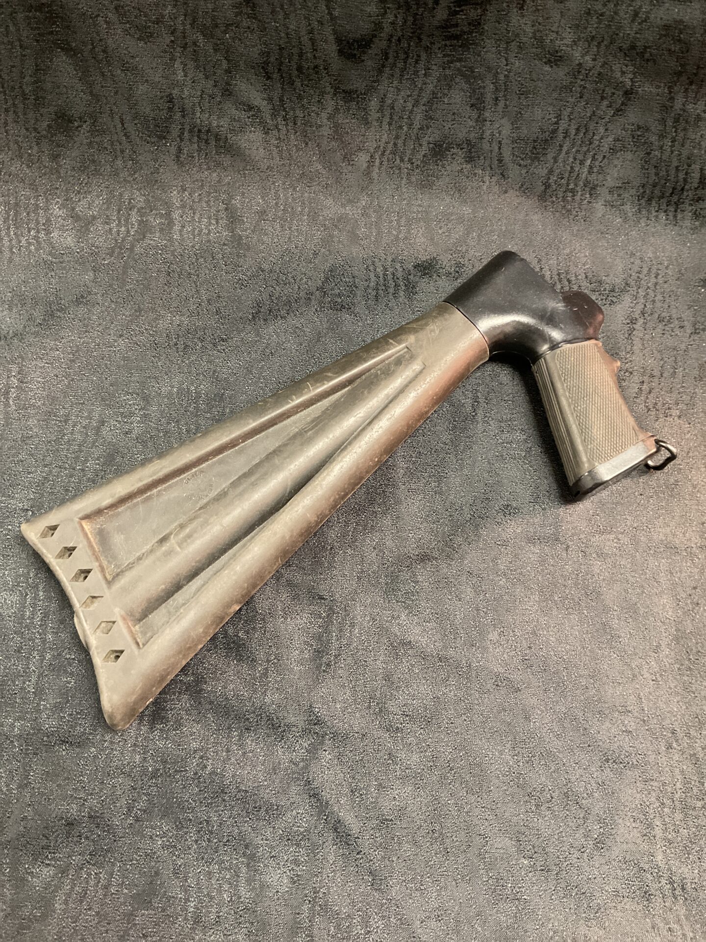 This rifle stock presents as a vintage item, showing signs of age and wear consistent with its history. The finish exhibits some surface scratches and minor imperfections, adding to its character. It would be of interest to collectors of vintage firearms, gun enthusiasts, or those undertaking restoration projects. The stock’s overall condition suggests it may require some cleaning or refinishing to restore it to its original appearance.