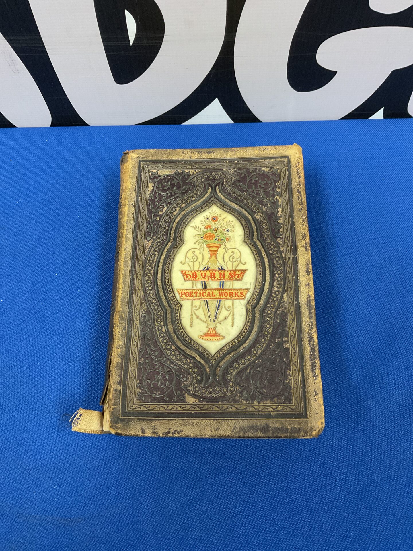 This antique book shows signs of age and wear consistent with its vintage. The cover exhibits some fading, scuffing, and minor damage, while the spine is worn but intact. Despite these imperfections, the book remains a desirable collectible for enthusiasts of Robert Burns, Scottish literature, or antique books. Its historical significance and aesthetic appeal make it a unique addition to any collection.