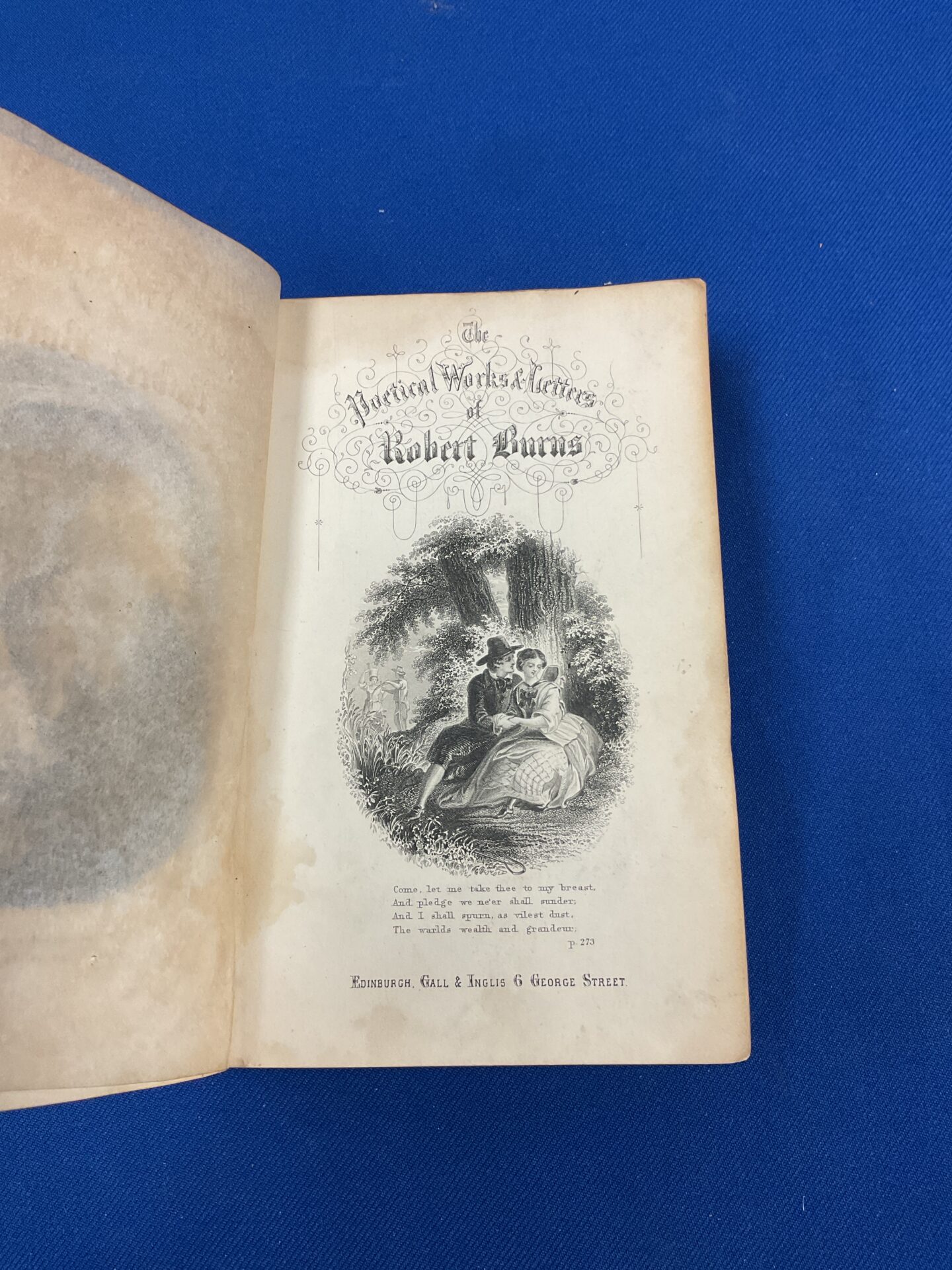 This is a beautifully bound antique copy of the Poetical Works & Letters of Robert Burns, published by Edinburgh Gall & Inglis. The book features an ornate embossed cover with intricate detailing and a decorative central cartouche. The cover is a rich brown with gold accents, and the spine shows remnants of gilt lettering. This edition represents a significant piece of Scottish literary history, showcasing the works of Scotland’s national poet.