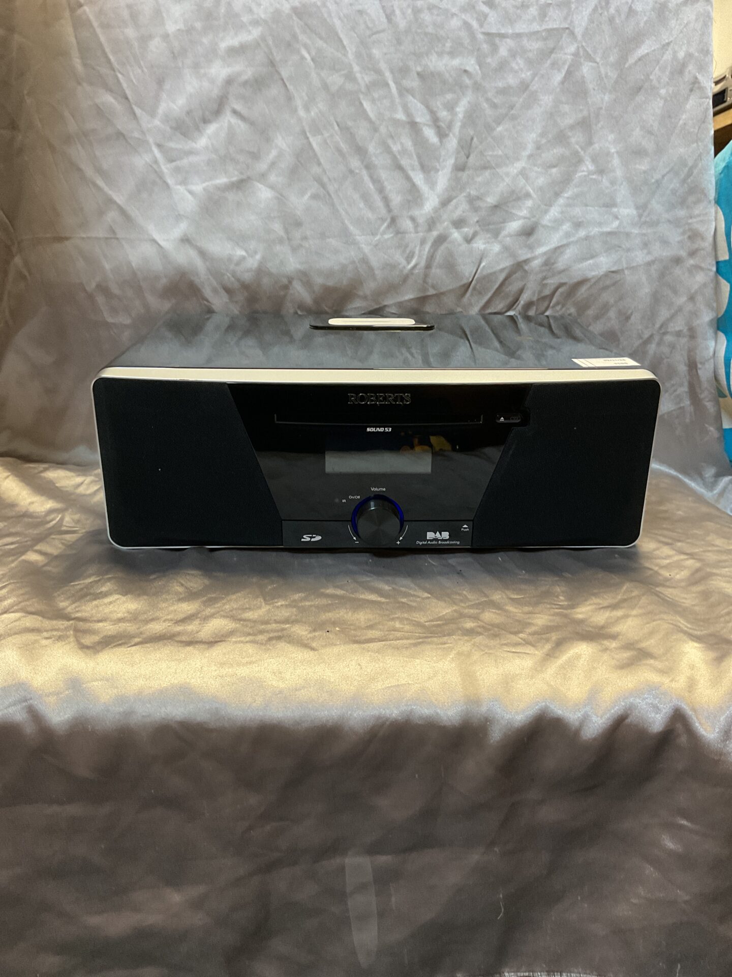 This Roberts MP-Sound 53 radio is presented for auction in used condition. The unit shows signs of previous use and may benefit from cleaning or restoration. It is offered as a collectible item or for repurposing, and is of interest to collectors of vintage or retro radios, or those seeking a portable digital radio with iPod connectivity.