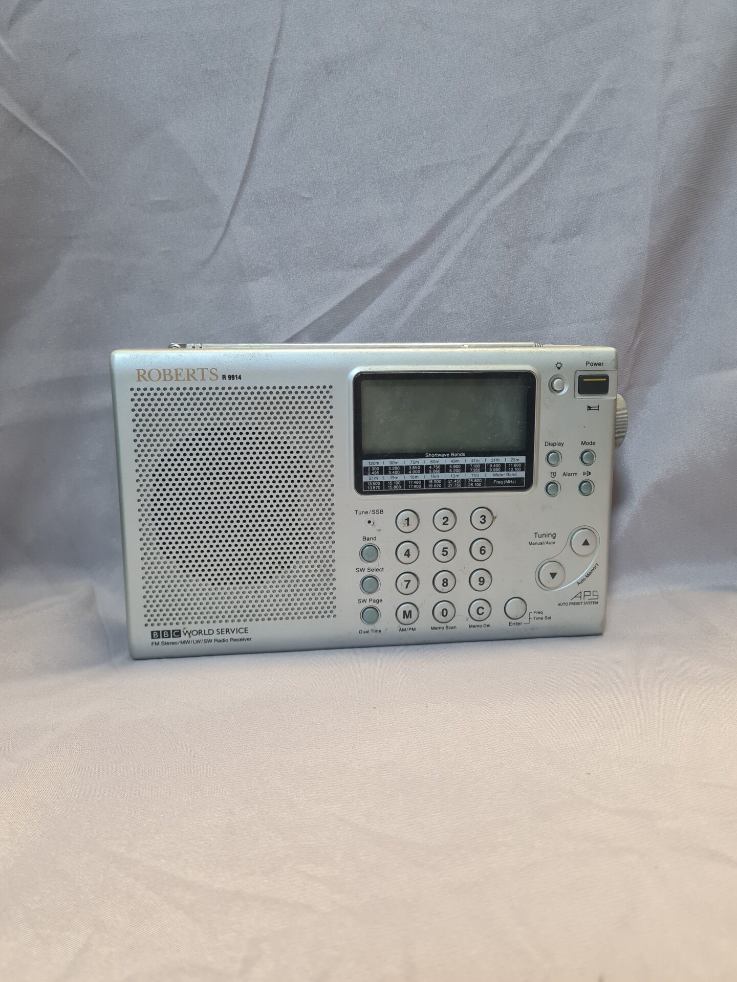 This is a Roberts R9914 BBC World Service FM Stereo/Radio Receiver. A classic example of British radio design, this portable radio is known for its robust build quality and excellent sound. It features a clear analogue dial, tuning controls, and a telescopic aerial for optimal reception. The R9914 was a popular choice for listeners seeking a reliable and high-performing radio, particularly for enjoying BBC broadcasts.