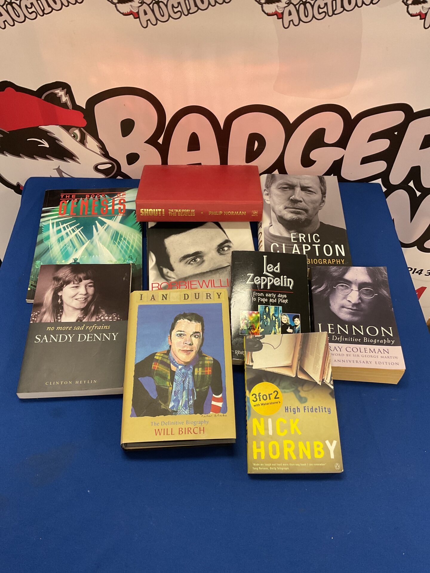 This lot comprises a collection of biographies detailing the lives of iconic rock stars. Included are books focusing on Eric Clapton and John Lennon, offering insights into their musical journeys, personal struggles, and lasting legacies. These books provide a fascinating glimpse into the world of rock and roll, appealing to both fans and those interested in musical history.