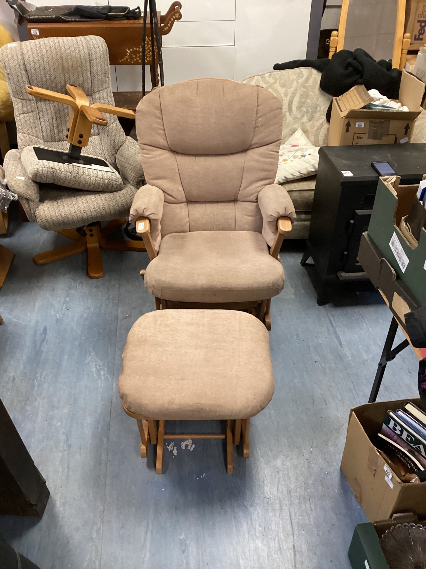 This set features a comfortable rocking armchair paired with a matching rocking footstool. The chair and footstool are upholstered in a neutral beige fabric, offering a classic and versatile aesthetic. The design suggests a focus on comfort and relaxation, making it a suitable addition to a living room, nursery, or reading nook.