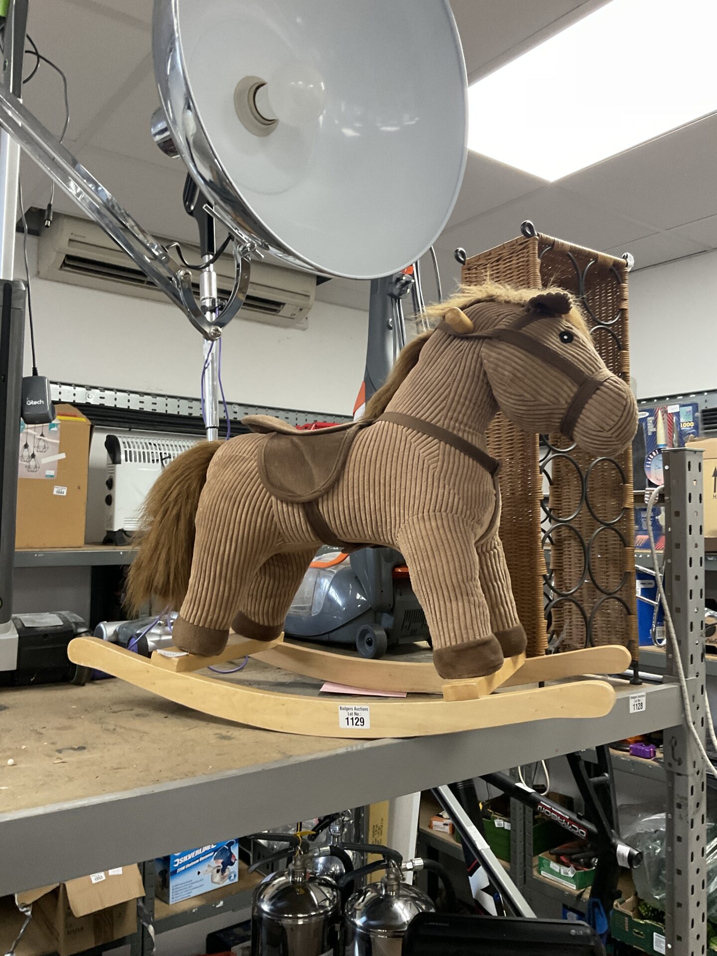 This is a charming rocking horse, designed for children’s play. The horse features a plush, brown fabric body over a wooden frame, creating a classic and inviting aesthetic. It is constructed with a sturdy wooden base, ensuring stability during use, and is designed to encourage imaginative play and early development.