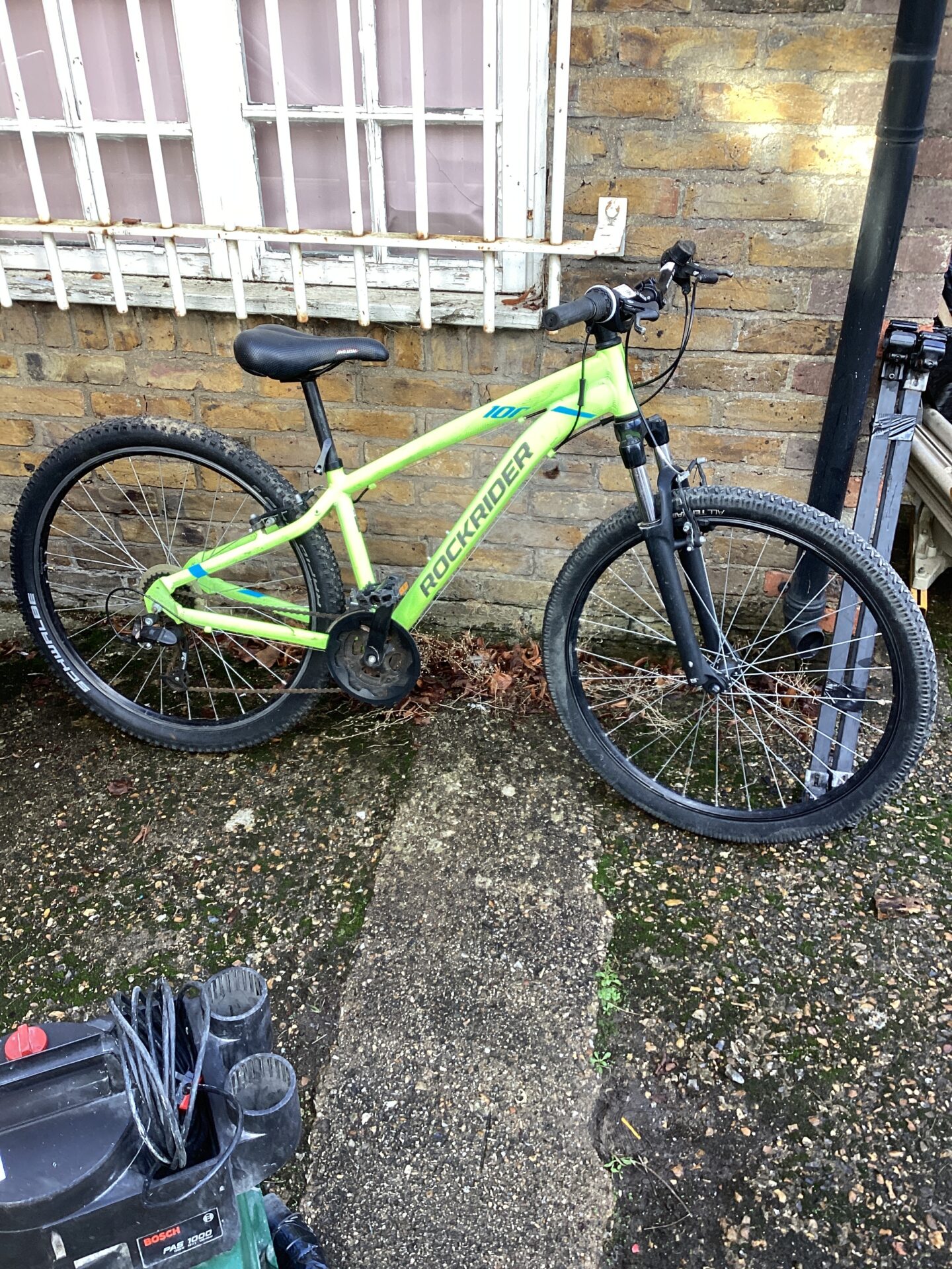 This Rockrider 100 mountain bike shows signs of use and may require attention. The bike’s condition is as seen in the provided images, and it is offered for sale in this state. It may appeal to someone looking for a project bike, or a cost-effective option for recreational cycling.