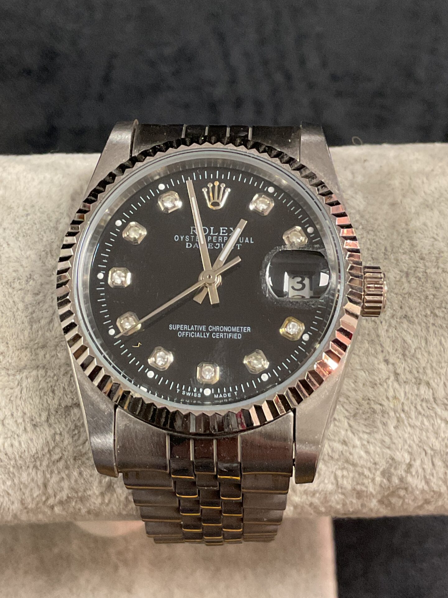 This vintage Rolex Oyster automatic wristwatch features a stainless steel case and bracelet, with a black dial and luminous markers. A classic timepiece for collectors or enthusiasts, this watch embodies the timeless elegance of the Rolex brand. Offered as viewed, this watch presents an opportunity to own a piece of horological history.