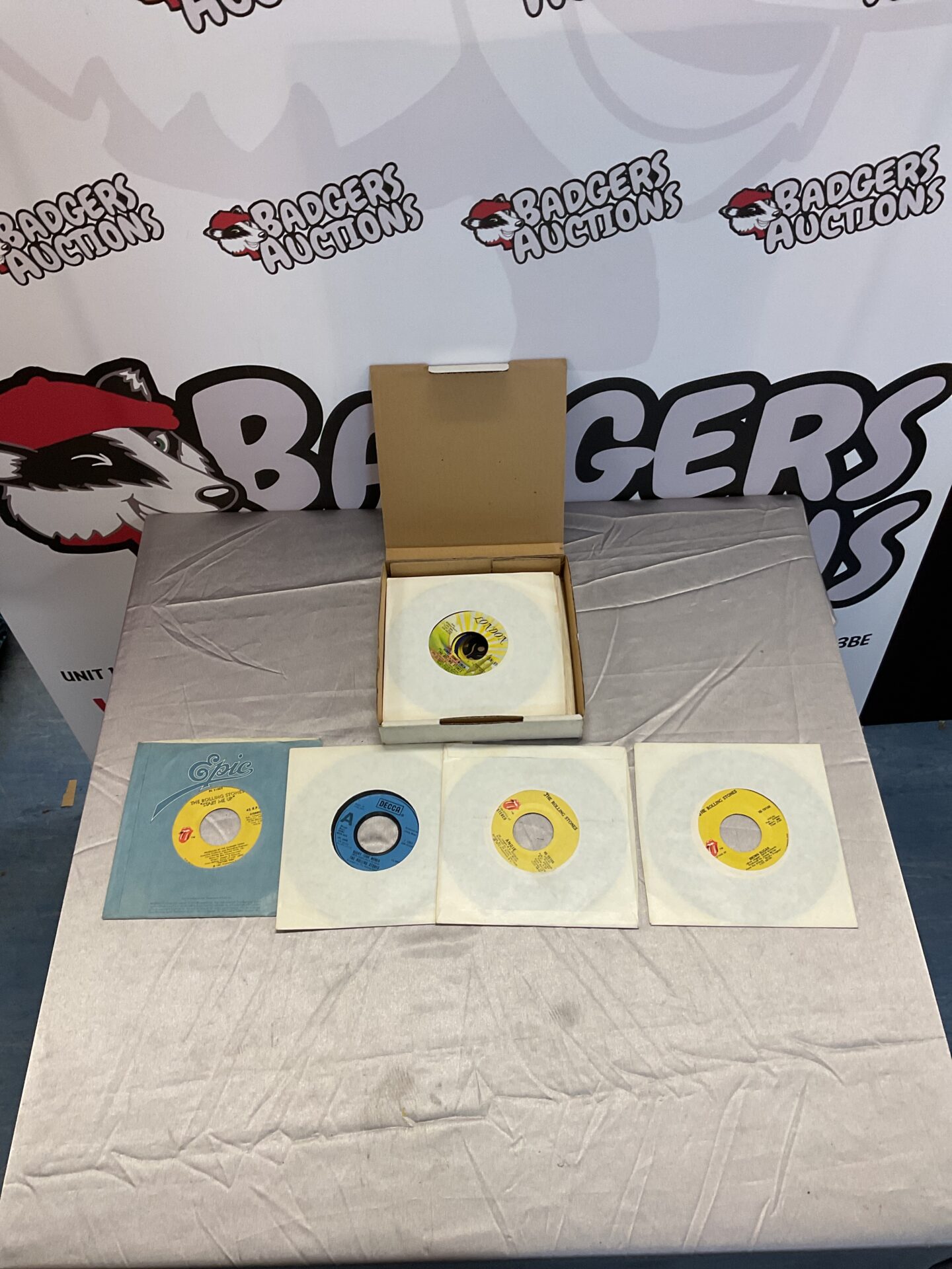 This lot comprises thirteen 7” vinyl singles by the iconic rock band, The Rolling Stones. The collection represents a selection of their popular tracks, offering a glimpse into the band’s extensive discography. These singles are a testament to the band’s enduring influence on music and popular culture, and would be a welcome addition to any music enthusiast’s collection.