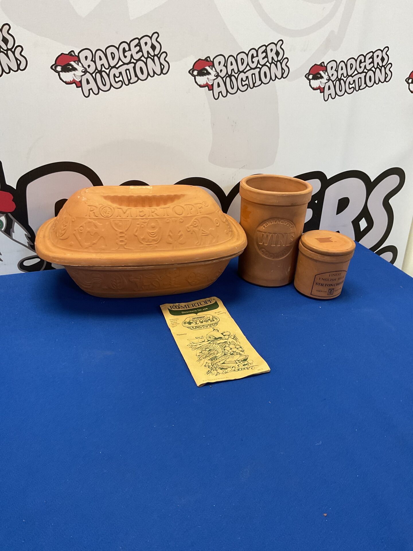 This charming set features a classic Romertopf terracotta cooking pot, accompanied by a matching terracotta wine cooler and a dedicated stilton cheese pot. The Romertopf is renowned for its ability to create moist and flavourful dishes through its unique cooking process, trapping steam within the earthenware. The set’s rustic aesthetic and practical design make it a delightful addition to any kitchen or dining space.