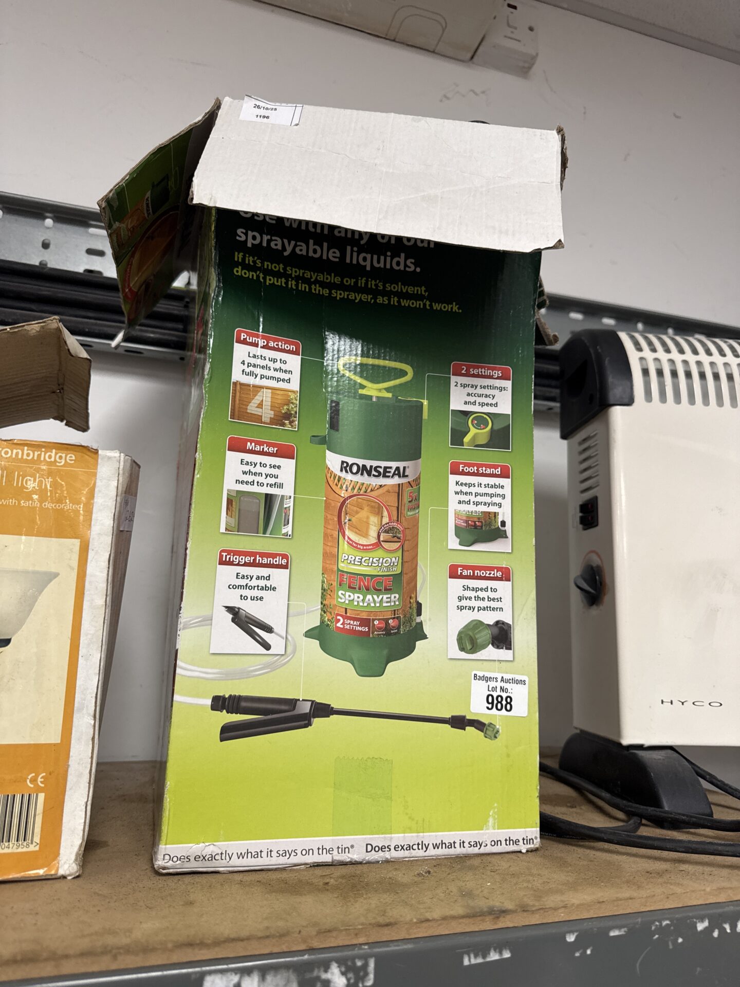 This is a Ronseal fence paint sprayer, designed for applying wood treatment and paint to fences and other outdoor structures. The sprayer features adjustable settings for controlling the spray pattern and flow rate, allowing for efficient and even coverage. It is intended for use with water-based preservatives and paints, and is designed to make the task of treating fences much easier than traditional brush application.
