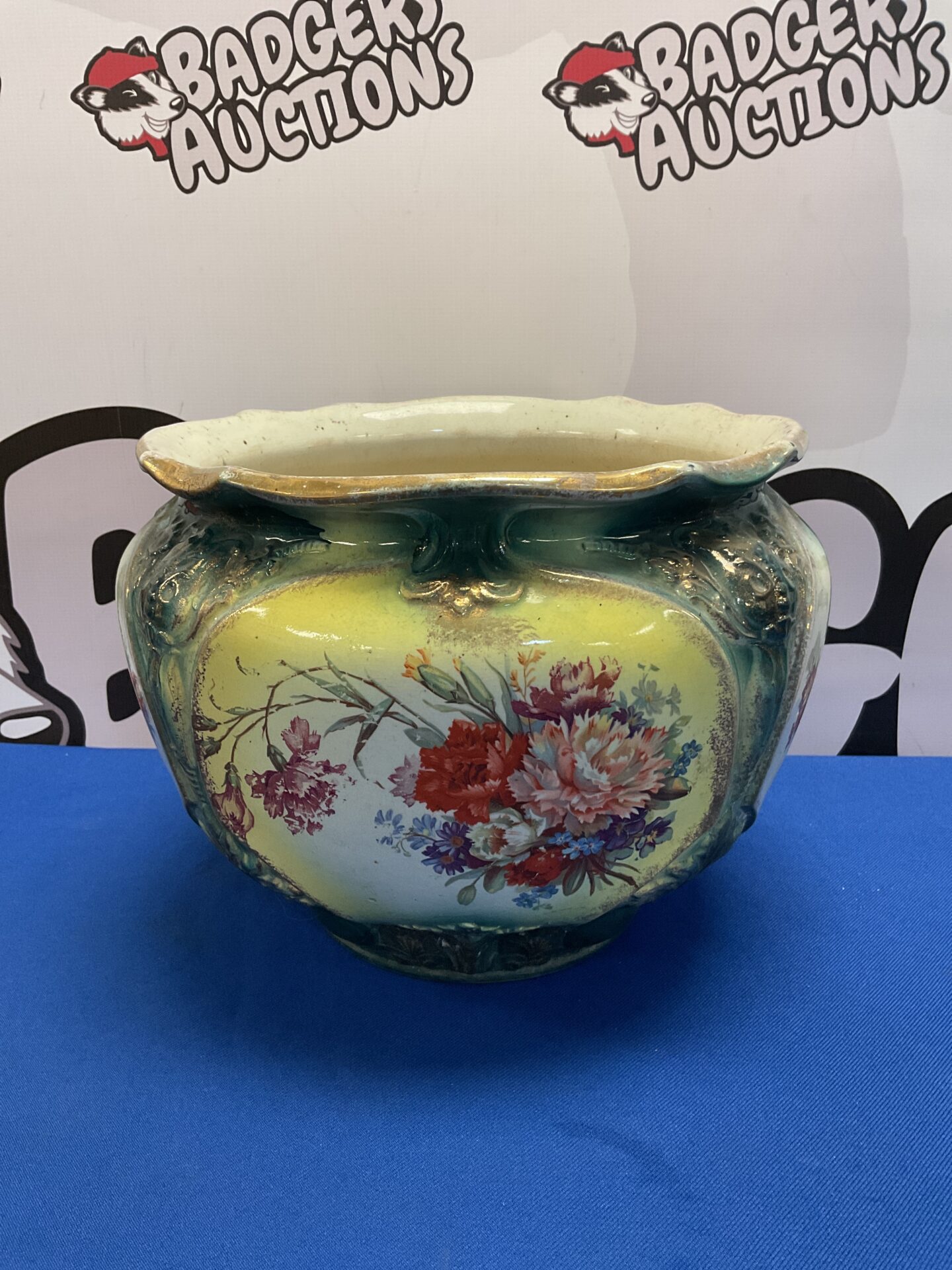 This is a beautifully decorated Roosevelt jardiniere, featuring a vibrant floral pattern. The jardiniere is crafted from pottery and displays a classic aesthetic, likely dating back to the early to mid 20th century. The intricate detailing and colour palette suggest a high level of craftsmanship, making it a desirable piece for collectors of vintage pottery and decorative arts.