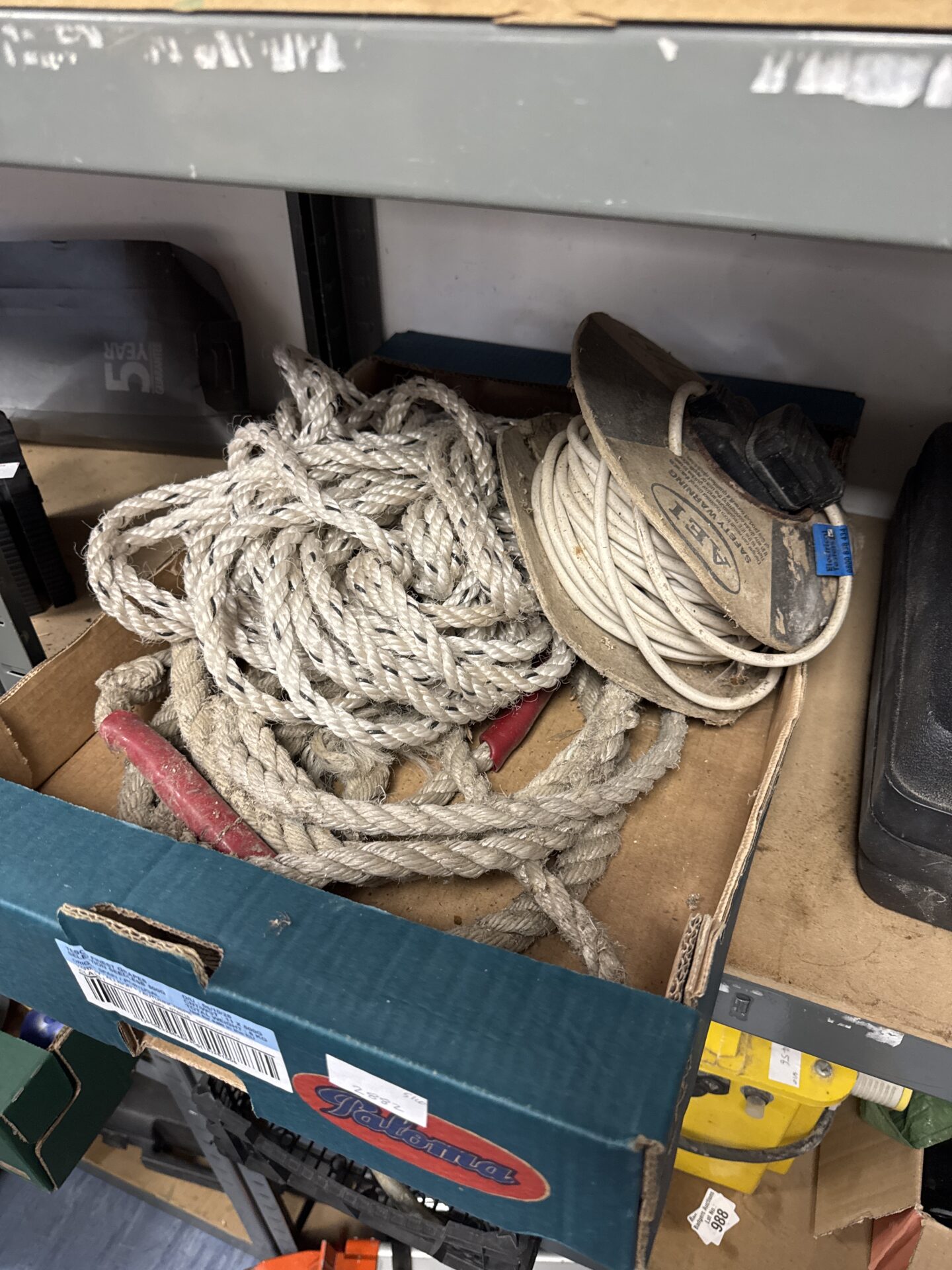 The rope appears to be in good, usable condition, with minimal wear and tear. The extension lead shows signs of previous use but remains functional. This lot would be of interest to gardeners, DIY enthusiasts, or anyone needing versatile utility items for home maintenance or outdoor activities.