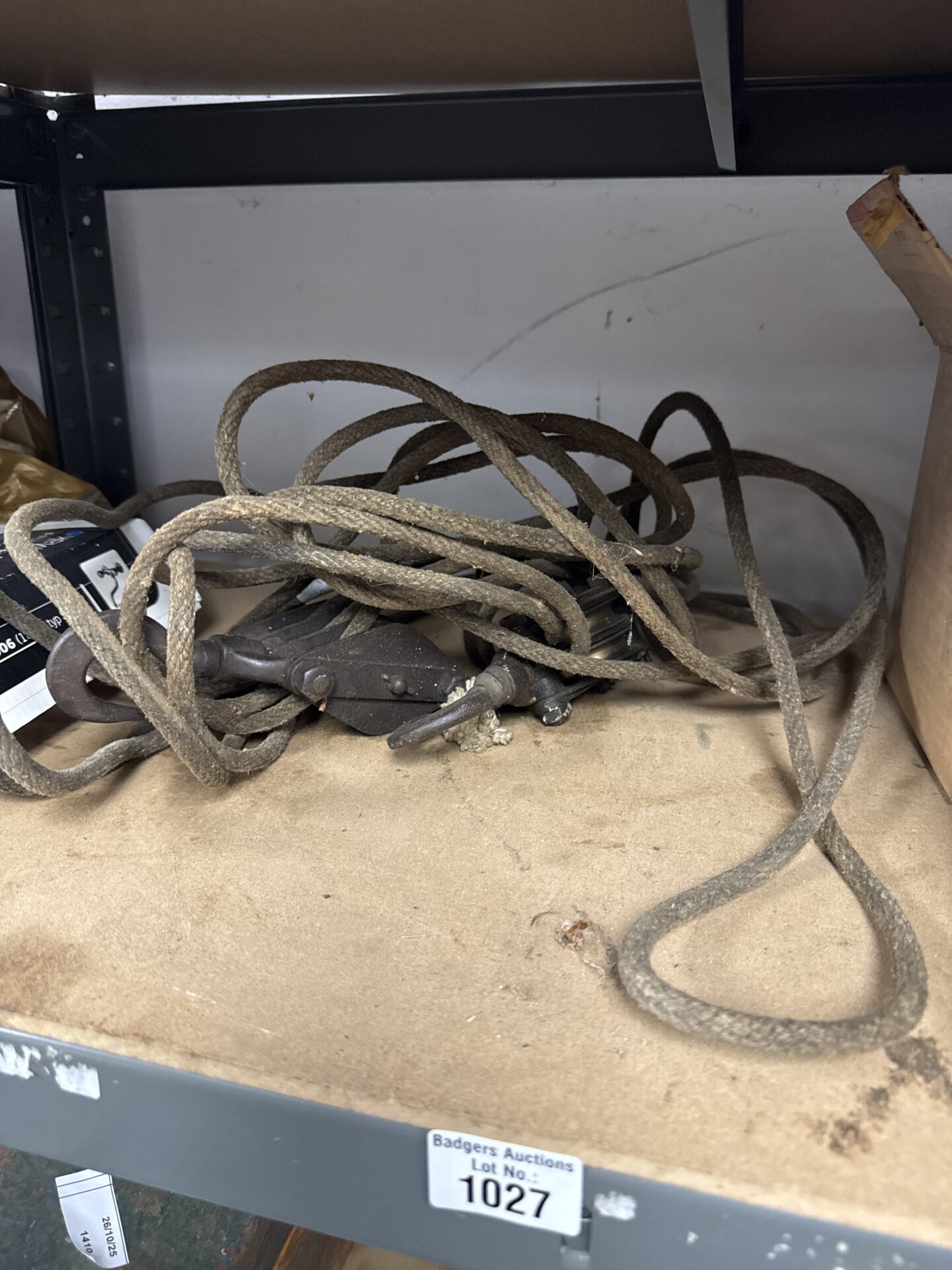 This lot features a length of thin rope integrated with two small pulleys. The rope appears to be a simple construction, likely intended for light-duty lifting or rigging applications. The pulleys are small and basic in design, suggesting a utilitarian purpose rather than decorative intent.
