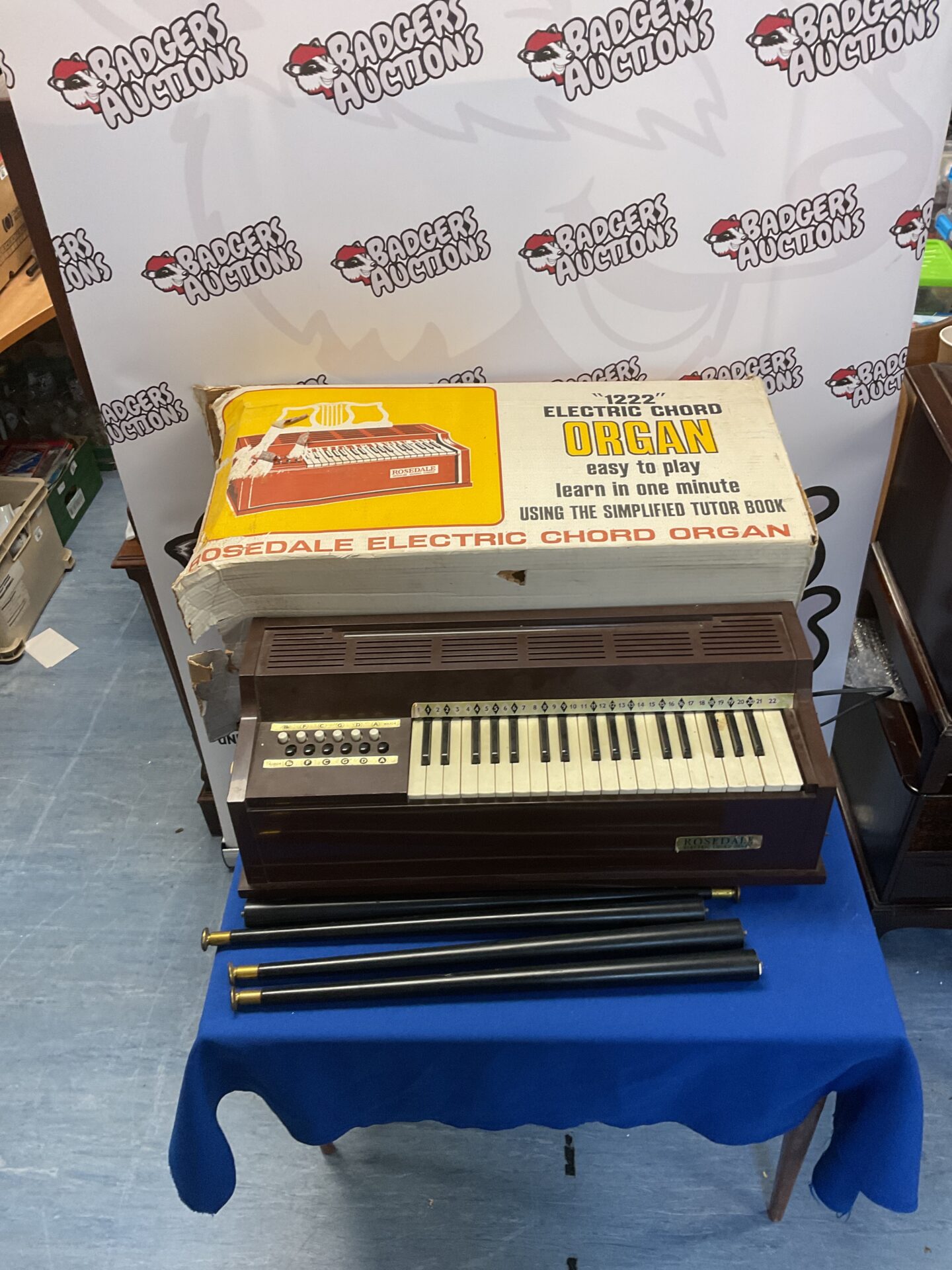 This is a Rosedale “1222” electric chord organ, a compact keyboard instrument designed for home use. Featuring a built-in chord system, it allows players to create full-sounding arrangements with ease. The organ’s design is typical of mid-century home entertainment equipment, with a wood-grain finish and simple controls.