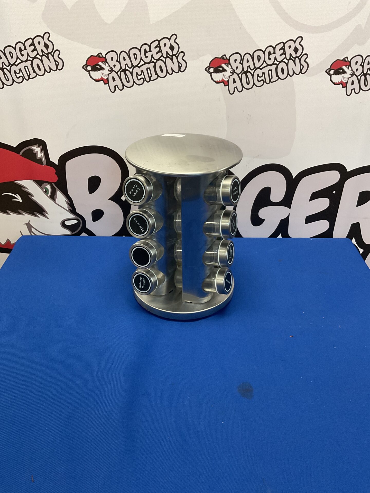 This is a charming vintage rotating spice rack, constructed from metal and complete with its original glass spice jars. The rack features a circular design, allowing easy access to all your favourite spices. Its retro aesthetic would make a delightful addition to any kitchen, offering both functionality and a touch of nostalgia.