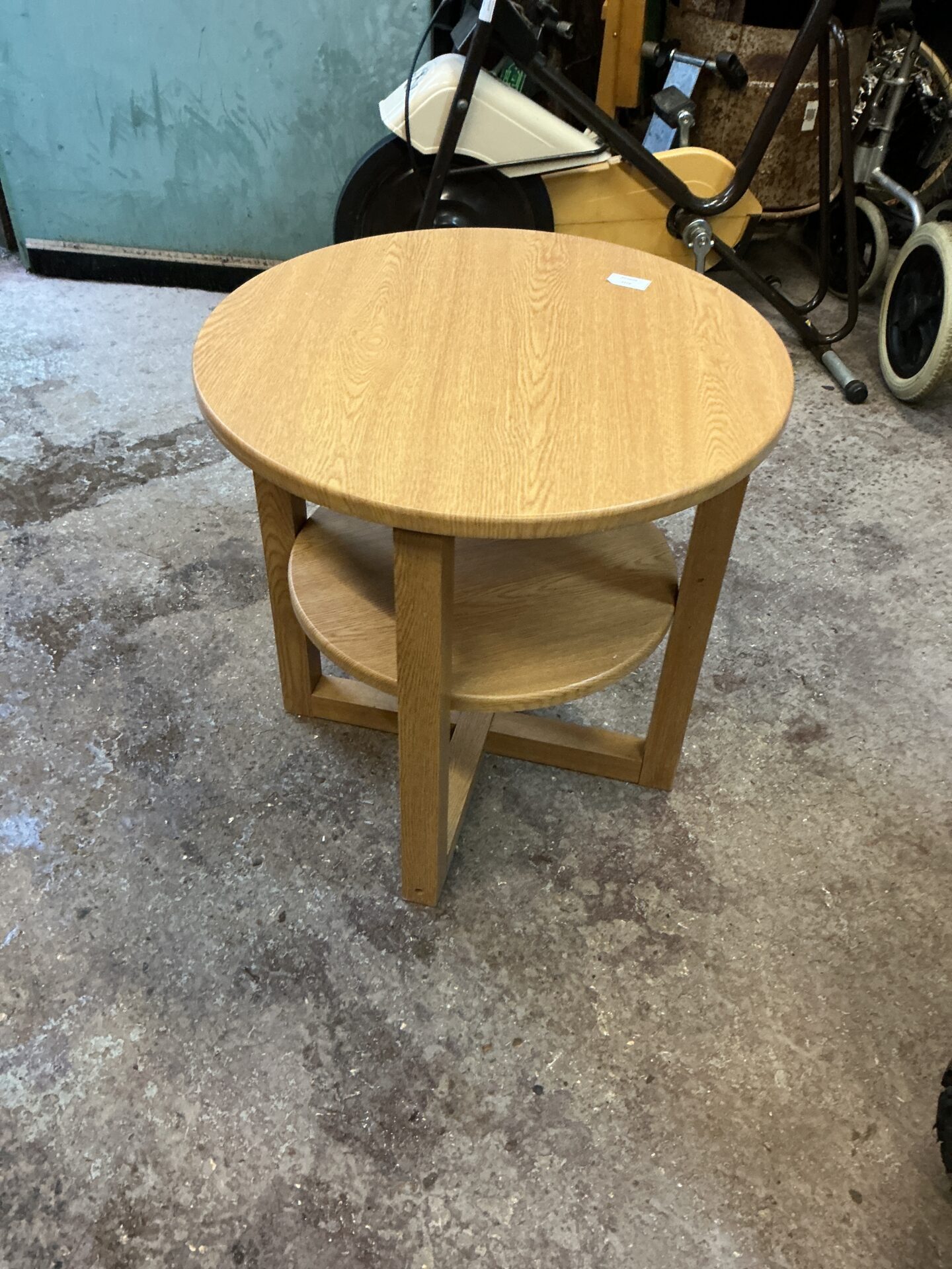 This is a small, round side table constructed with an oak effect finish. The table features a single shelf below the tabletop, providing additional storage or display space. Its compact size makes it ideal for use as a bedside table, a hall table, or a small side table in a living room setting.