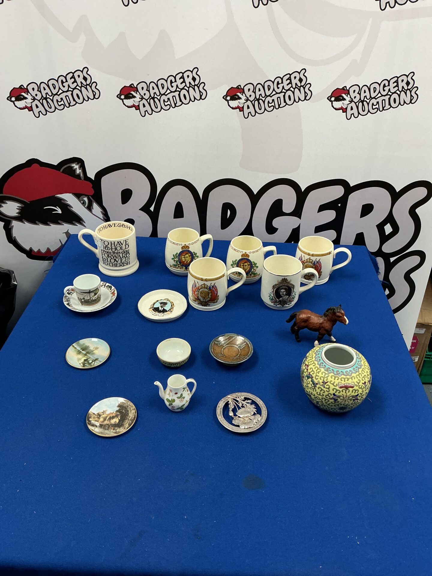 This lot comprises a collection of Royal Commemorative mugs, primarily celebrating events related to the British Royal Family, with a focus on Queen Elizabeth II. The mugs showcase various designs, likely spanning different eras of the Queen’s reign, and potentially commemorating significant events like coronations, jubilees, and weddings. The collection offers a glimpse into the history of royal celebrations and the associated commemorative china produced over the years.
