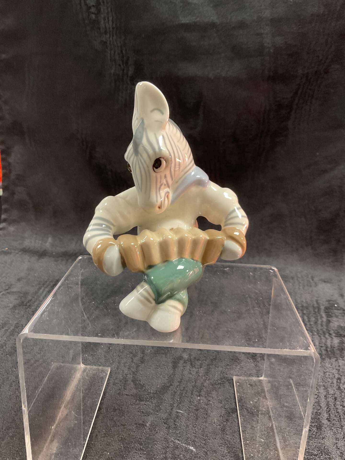 This charming figurine depicts a zebra playing an accordion, crafted by Royal Dux, renowned for their high-quality porcelain and artistic sculptures. The piece exhibits a delightful blend of whimsy and artistry, capturing the animal in a playful pose. The detailed modelling and vibrant glaze contribute to its unique appeal, making it a standout piece for collectors of animal figurines or art deco ceramics.