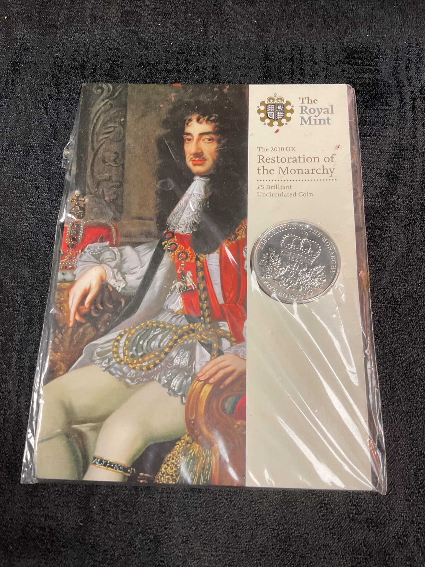 901 The Royal Mint 2010 Uk Restoration Of The Monarchy £5 Brilliant Uncirculated Coin In Sealed Bag
