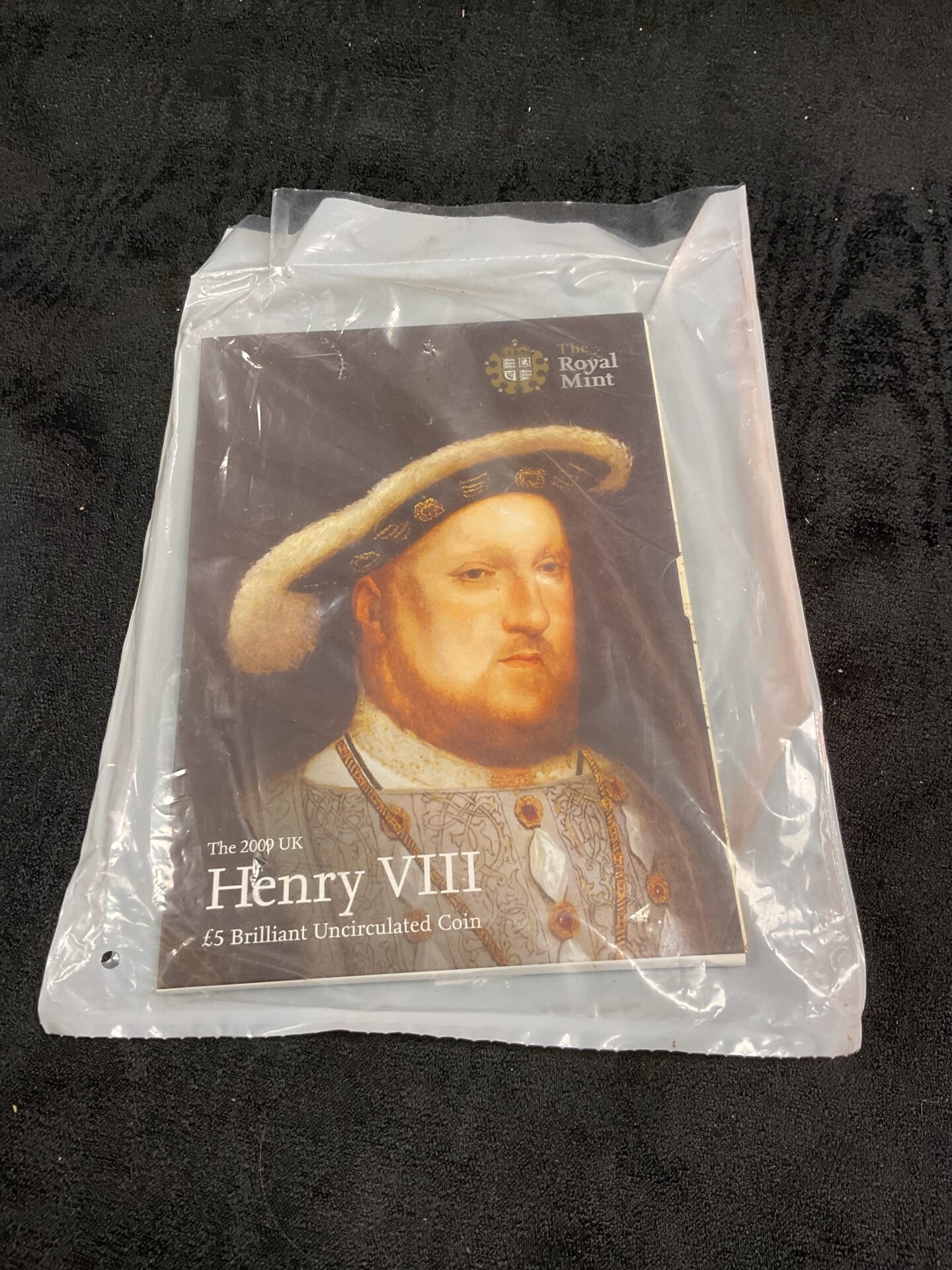 This is a brilliant uncirculated five pound coin issued by the Royal Mint in 2009, commemorating Henry VIII. The coin features a portrait of Henry VIII on the reverse, and is part of a series celebrating significant historical figures. It was produced to a high standard of finish, intended for collectors and enthusiasts of British numismatics.