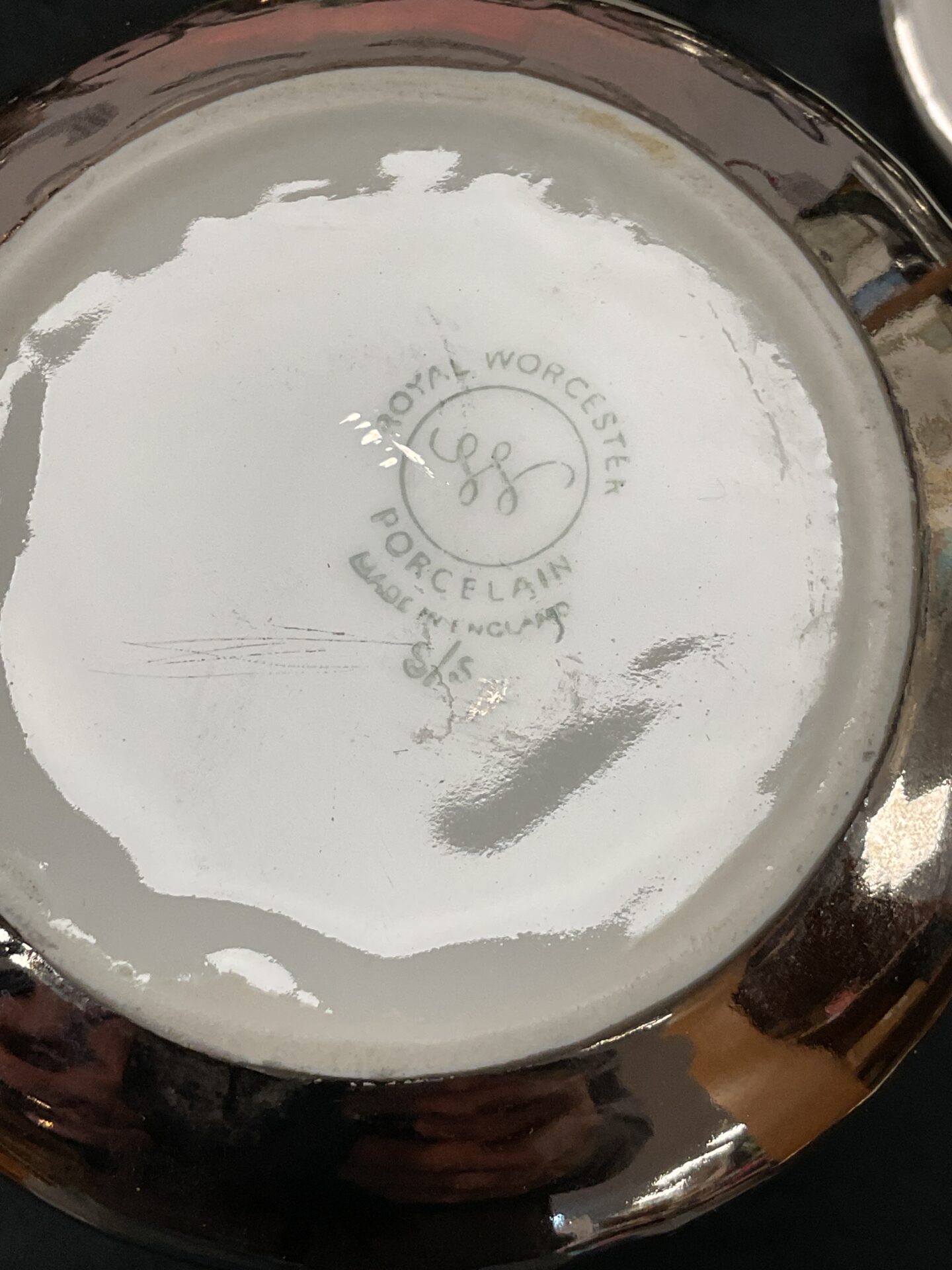 The set presents as a collection of pieces, with some items appearing to be part of a larger service and others being individual additions. While the lustre finish remains largely intact, there is evidence of age and use, including minor wear and possible imperfections consistent with vintage porcelain. This set would appeal to collectors of Royal Worcester, silver lustre ware, or art deco ceramics, offering a unique and decorative addition to any collection or display.