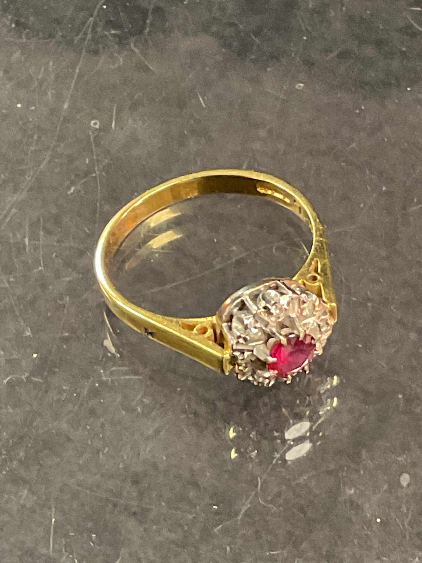 This elegant ring features a central round cut ruby surrounded by a sparkling cluster of diamonds, all set in 18 carat gold. The design showcases a classic aesthetic, with the ruby providing a vibrant focal point against the brilliance of the diamonds. The ring is a size N and weighs 3.5g, offering a comfortable and eye-catching piece of jewellery.