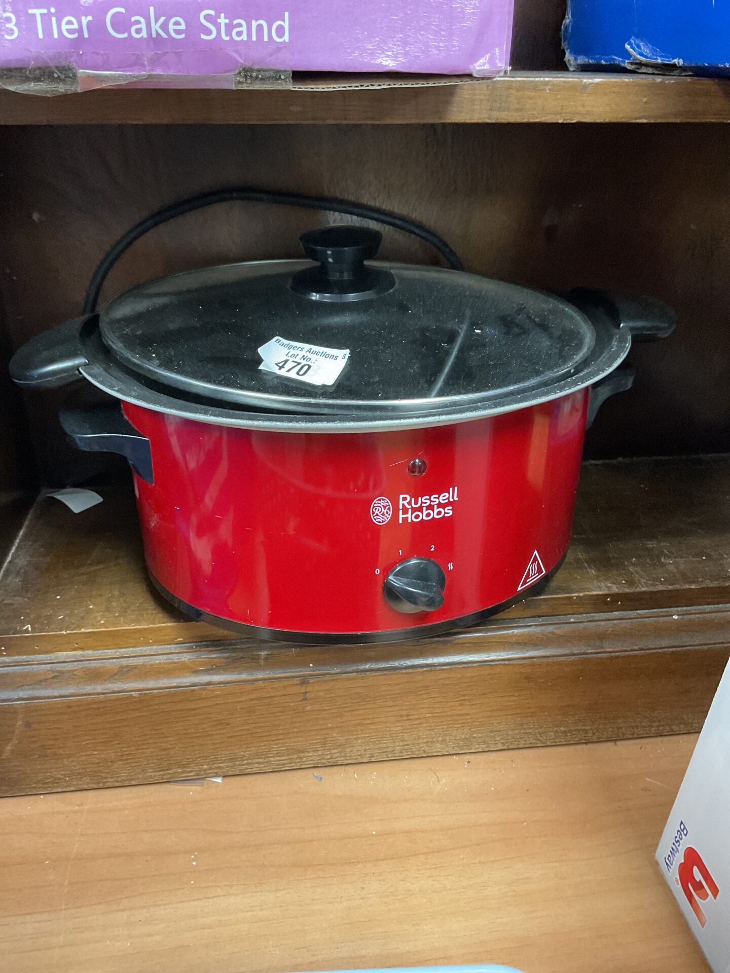 This is a Russell Hobbs slow cooker, model number 1931. It features a ceramic cooking pot, ideal for slow cooking stews, casseroles, and other dishes. The cooker has a simple design and is intended for countertop use, offering a convenient way to prepare meals with minimal effort.