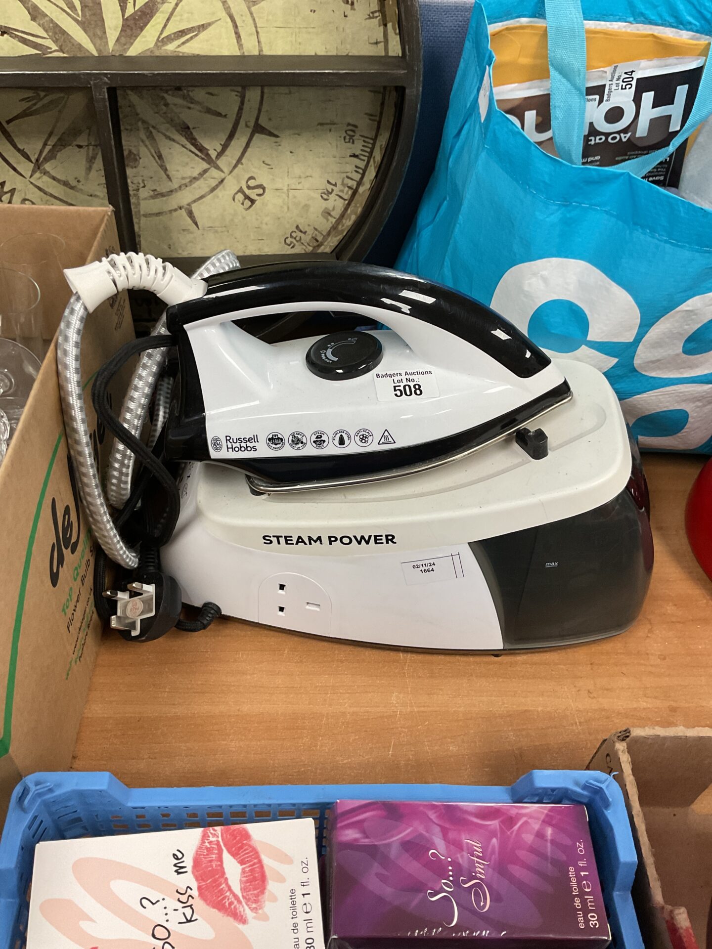 This is a Russell Hobbs Steam Power Iron, a classic household appliance designed for effective garment care. The iron features a robust construction and a steam function intended to smooth out wrinkles with ease. Its design reflects a period when appliances were built to last, offering both functionality and a touch of retro style.