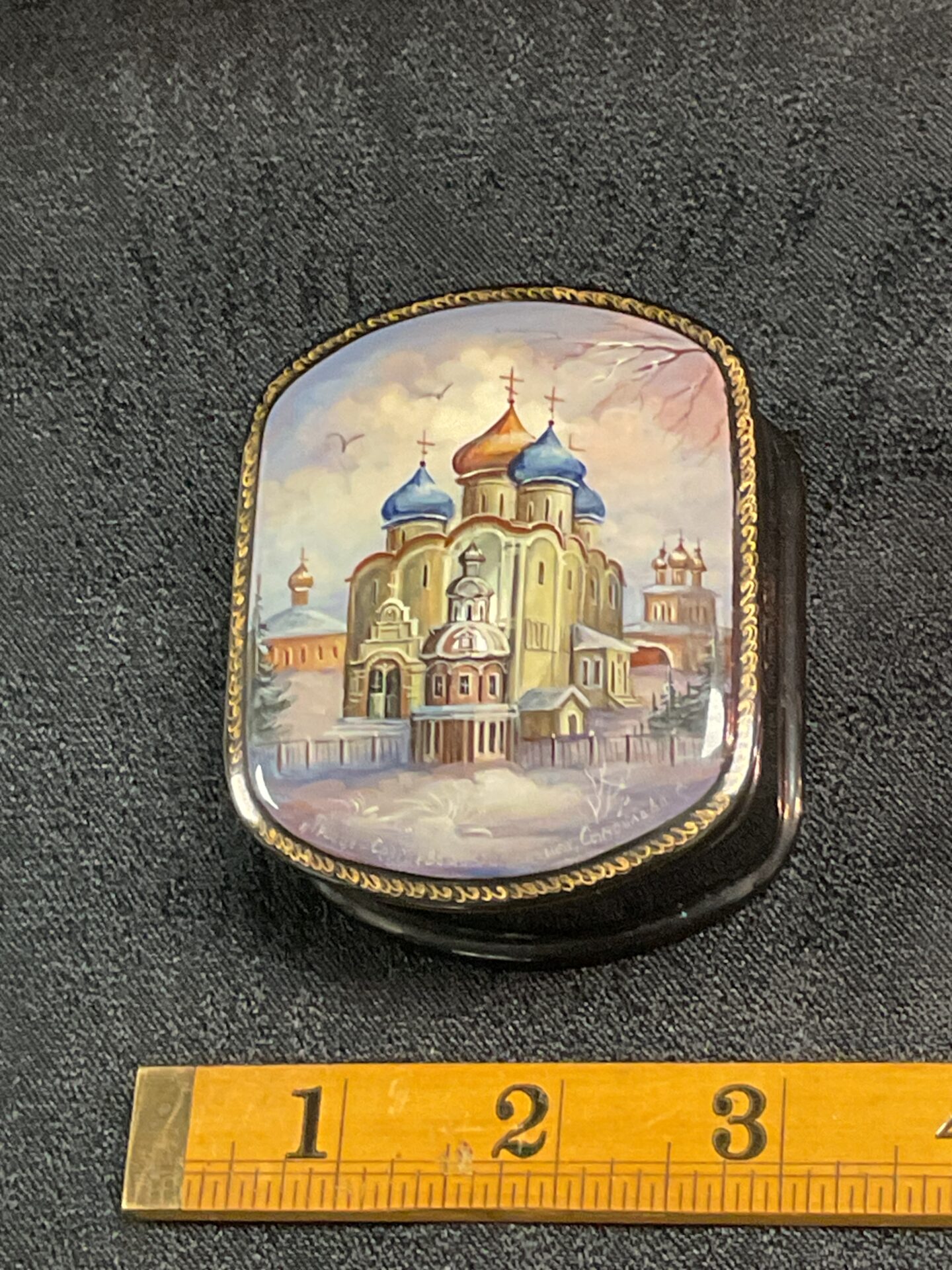 This is a beautifully hand-painted Russian lacquer box, crafted using the traditional papier-mache technique. The box features a detailed scene, likely depicting a Russian Orthodox church or cathedral, rendered in vibrant colours and intricate detail. These boxes are a hallmark of Russian craftsmanship, often produced in workshops around the city of Palekh, known for its distinctive style of miniature painting. The artistry and skill involved in creating these boxes make them highly sought after by collectors of folk art and Russian memorabilia.