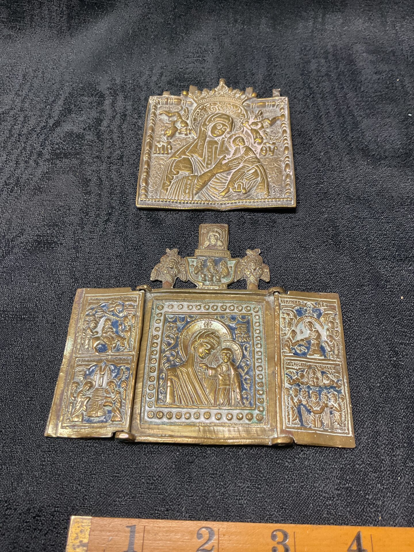 This pair of 19th-century Russian Orthodox icons showcases exquisite craftsmanship. The upper icon is a single panel, while the lower is a beautifully detailed folding triptych – a three-part hinged panel. Both are constructed from brass and feature vibrant enamelled details, depicting religious scenes and figures characteristic of Orthodox iconography. These icons would have been used for personal devotion and prayer within a home or small chapel.