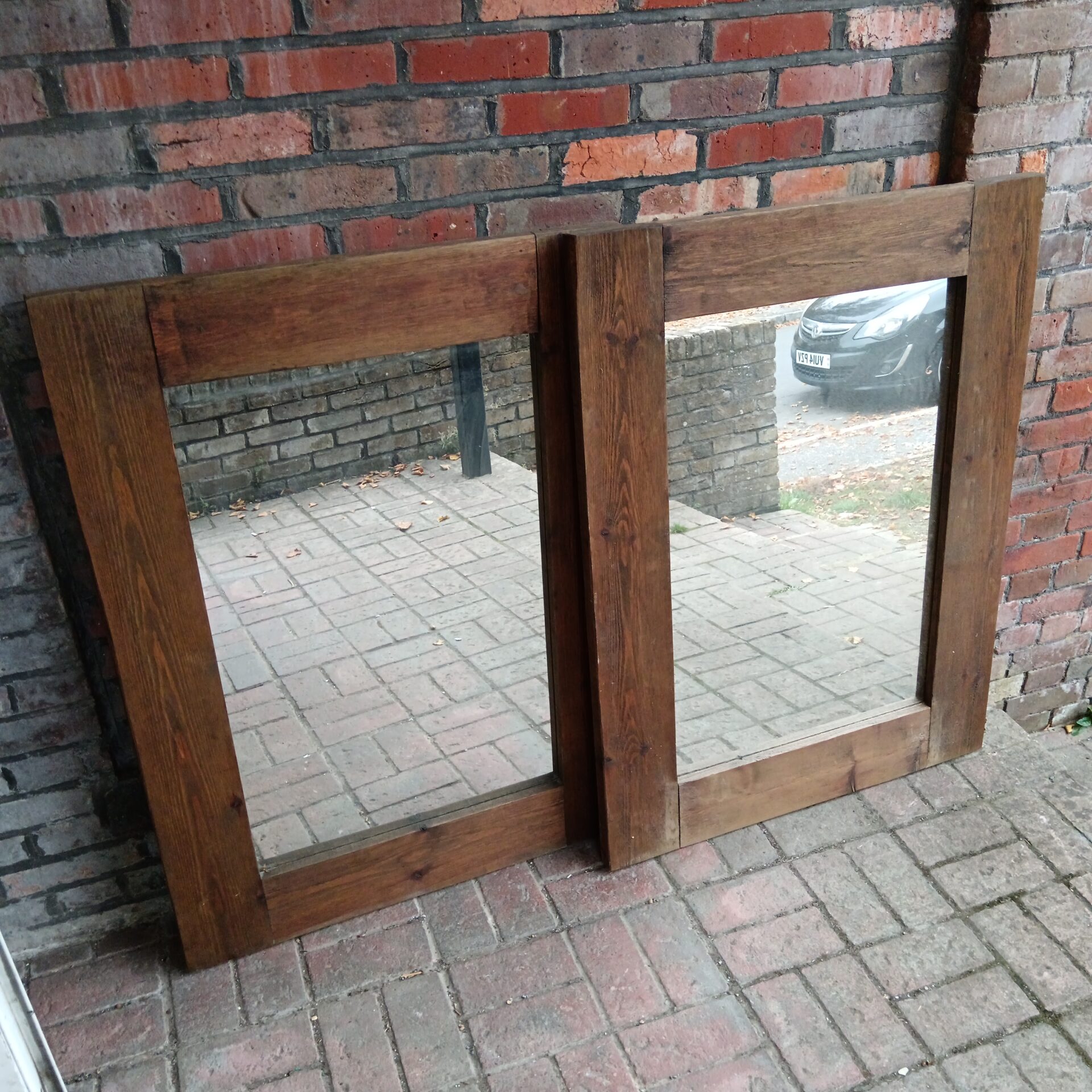 The mirrors are in good vintage condition, with expected signs of wear consistent with their age and previous use. The pine frames may exhibit minor imperfections, such as knots or slight variations in colour, which contribute to their authentic rustic charm. These mirrors would appeal to collectors of farmhouse or vintage décor, as well as those seeking unique statement pieces for their homes. Their size and quality make them a desirable addition to any interior.