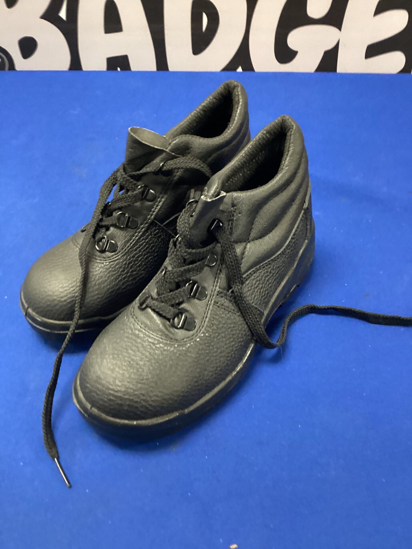 These are a pair of safety boots, designed for industrial or construction work. The boots feature a lace-up closure and appear to be constructed from a durable leather or synthetic material. They are a size 4, intended to provide foot protection in demanding environments.