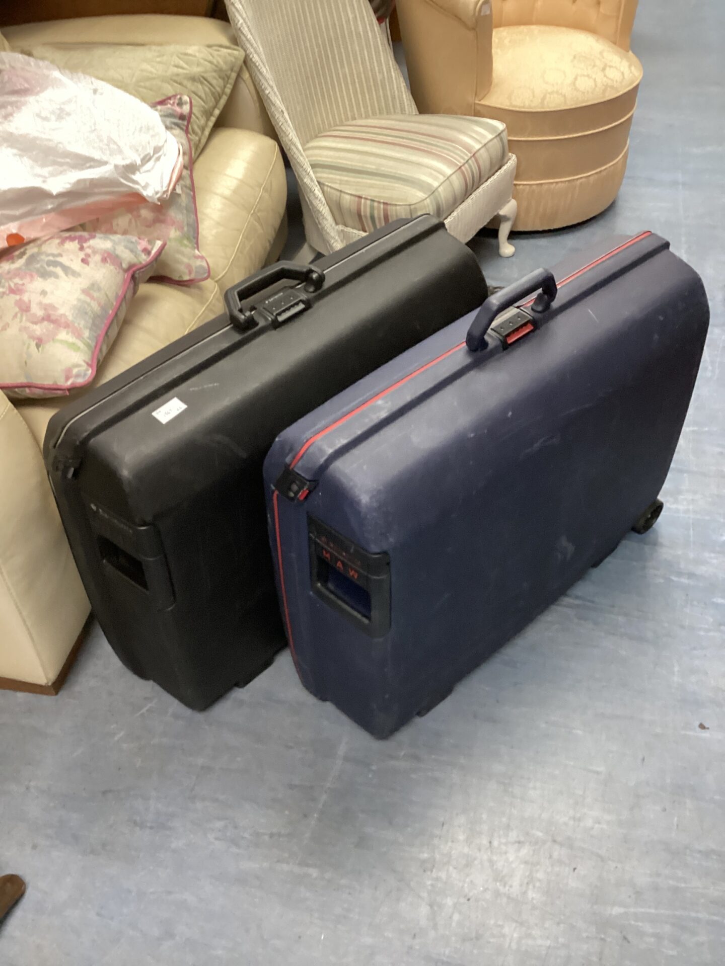 These two large Samsonite suitcases represent classic travel style. Constructed with durable hard shells, these suitcases are designed for protection and longevity. They feature robust handles and secure locking mechanisms, indicative of Samsonite’s commitment to quality luggage. These suitcases evoke a sense of adventure and timeless design.
