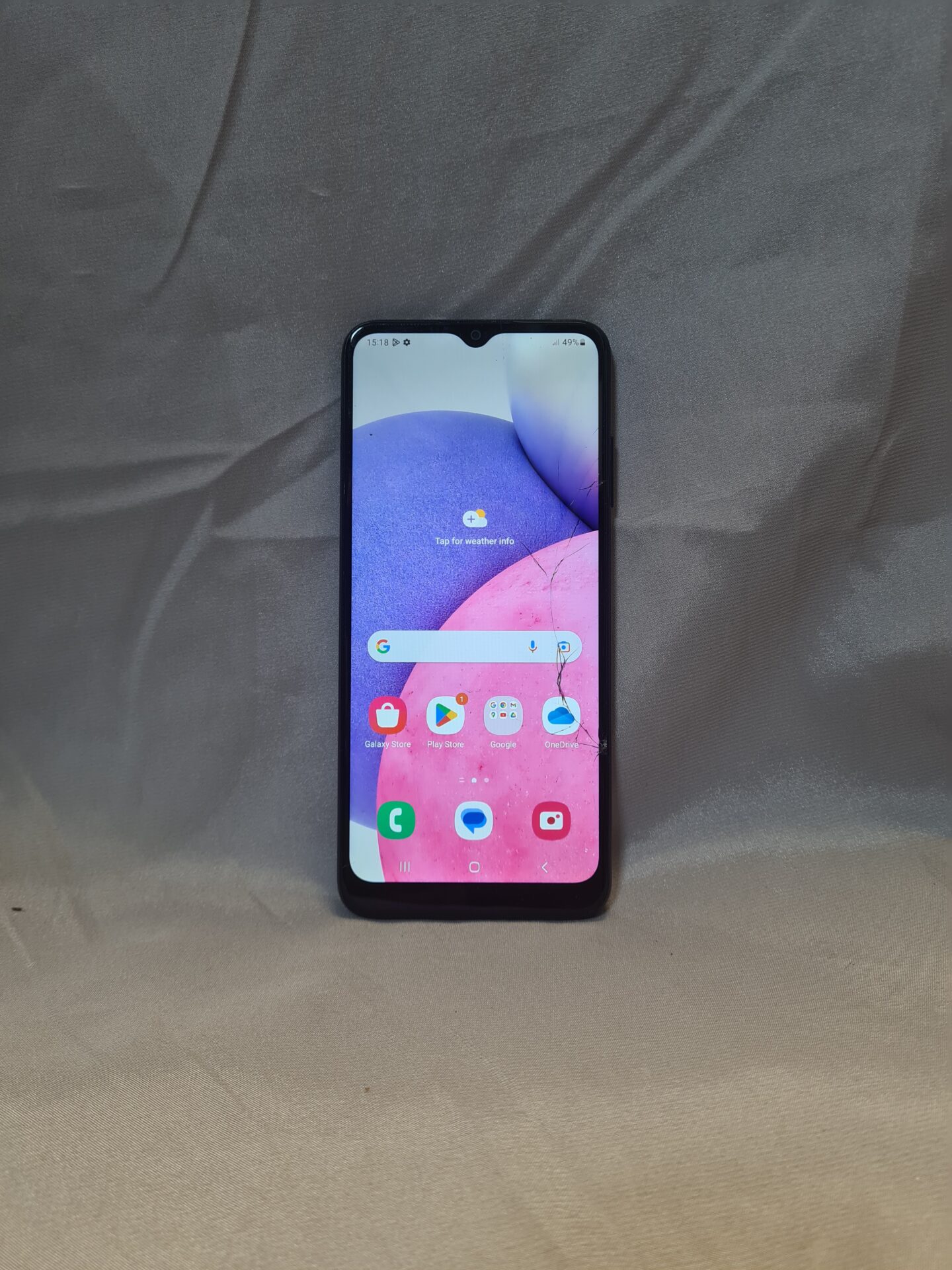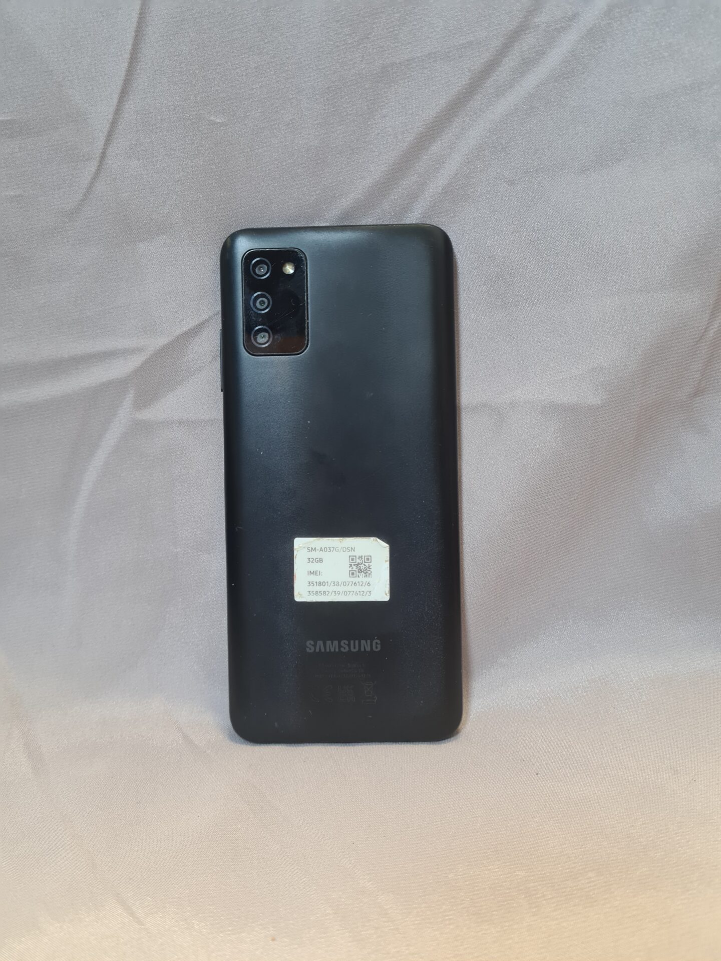 This Samsung Galaxy A03s exhibits signs of use. The screen has a visible crack. Despite this, the device may still be of interest to a collector of mobile technology or someone seeking a project phone.