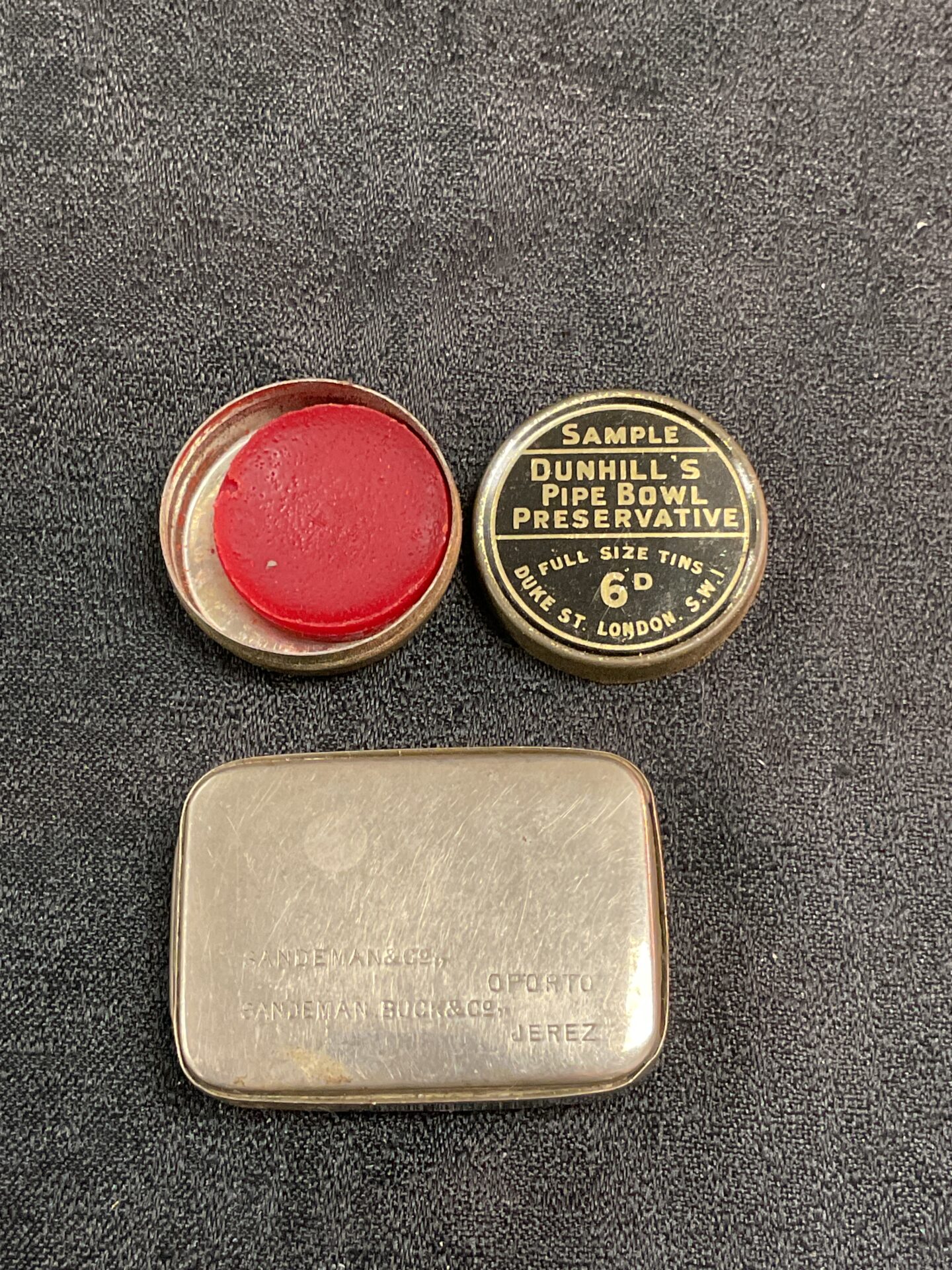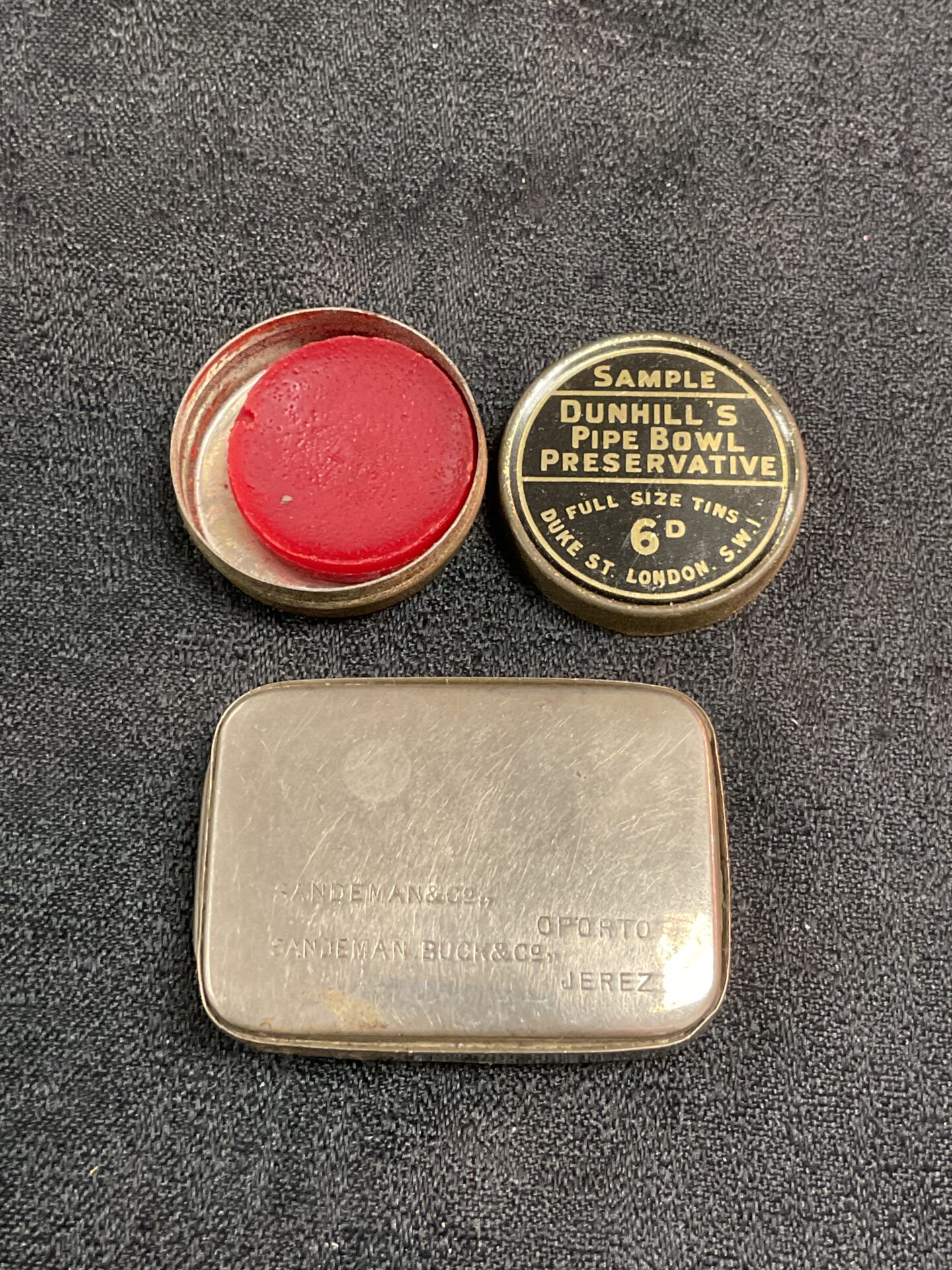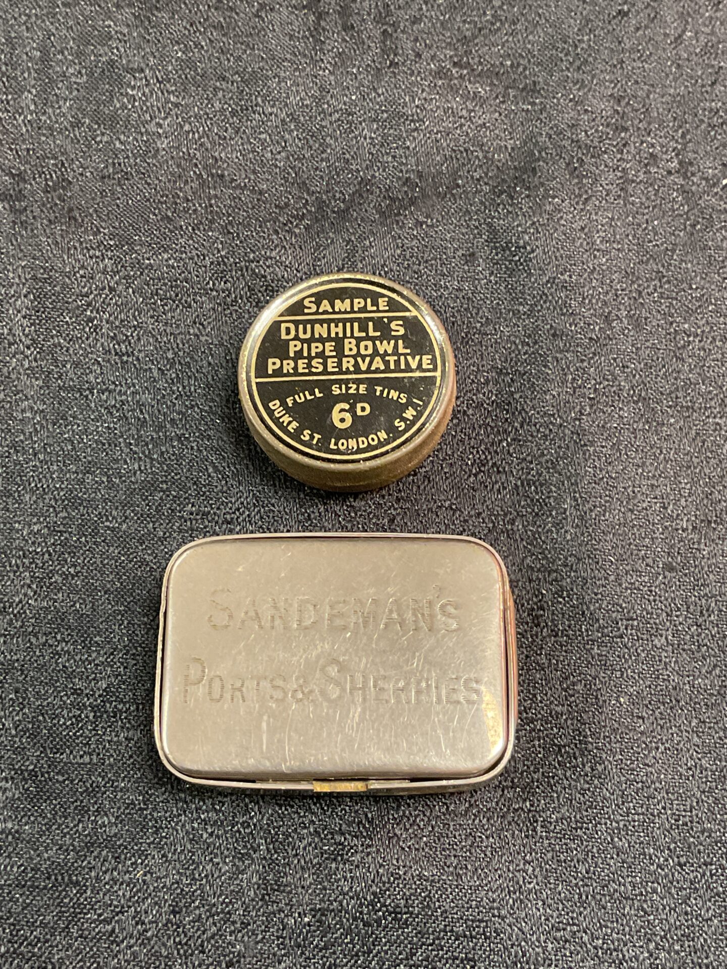 This lot comprises a Sandemans port and sherry vesta case, crafted from brass, and a Dunhill’s Pipe Bowl Preservative tin. The vesta case features embossed branding and was designed to hold matches (vestas) for lighting pipes or cigarettes. The Dunhill tin, a sample size, is similarly branded and would have contained a preservative to keep pipe bowls in good condition. Both items represent a bygone era of smoking culture and advertising.