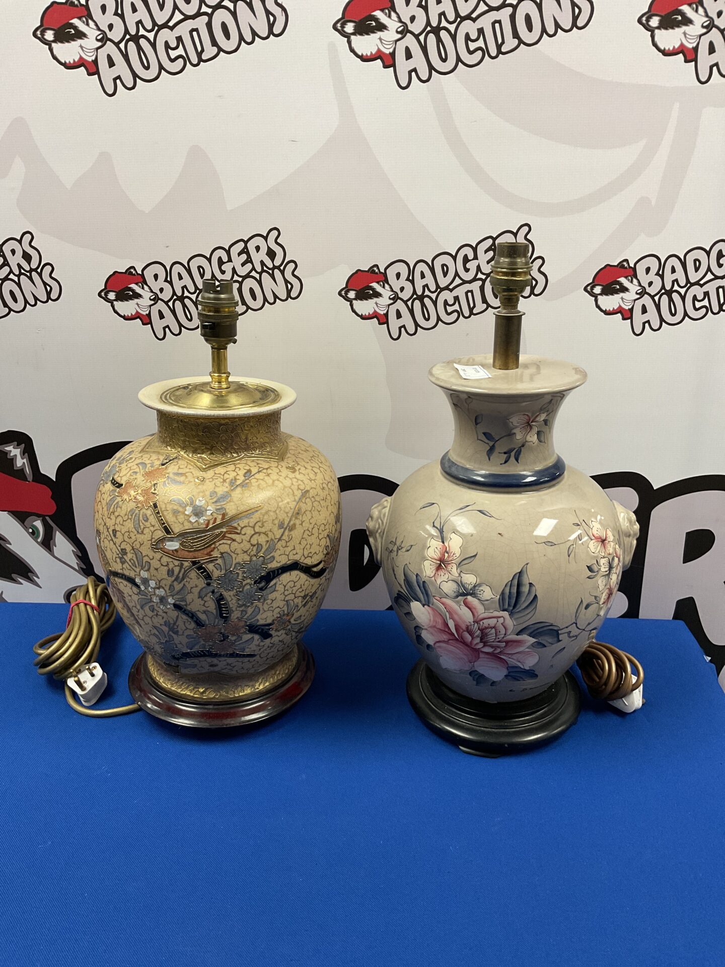 These are two beautifully decorated Satsuma style table lamps. Crafted from porcelain, these lamps feature intricate hand-painted designs depicting floral motifs and scenes, characteristic of the Satsuma ware tradition. The lamps exhibit a vibrant colour palette and detailed artistry, showcasing the skill of the artisans who created them.