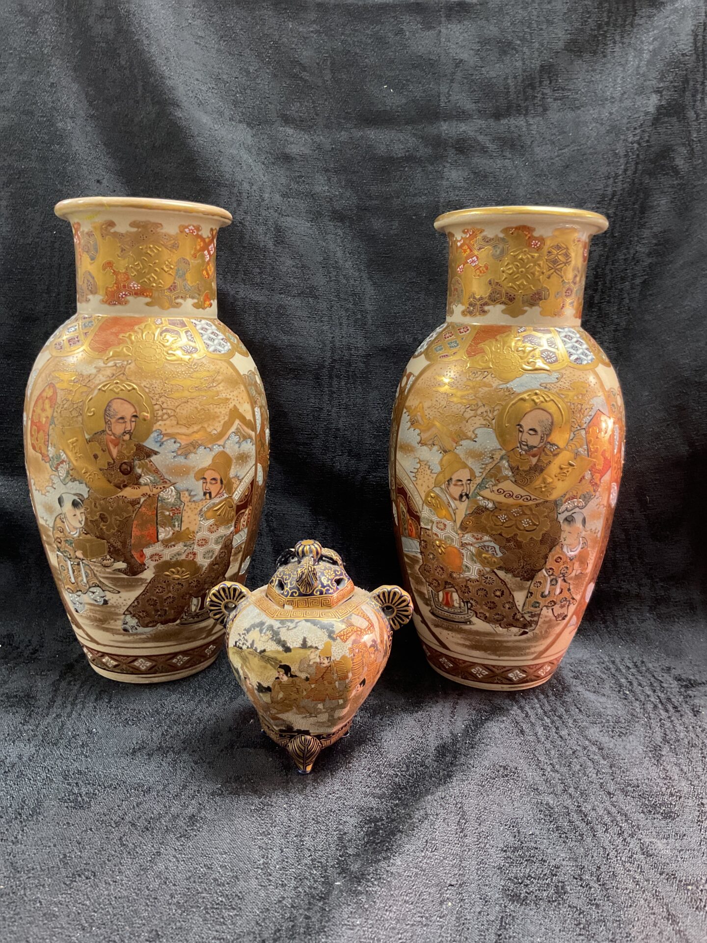 This lot comprises two beautifully decorated Satsuma vases and a small lidded jar, showcasing the intricate artistry of Japanese ceramics. The vases and jar are adorned with detailed scenes, likely depicting figures and landscapes, rendered in vibrant colours and fine detail characteristic of Satsuma ware. Satsuma pottery is renowned for its delicate porcelain body and elaborate enamelled decoration, often featuring gilded accents and complex compositions. These pieces exemplify the skill and aesthetic sensibilities of the artisans who created them.