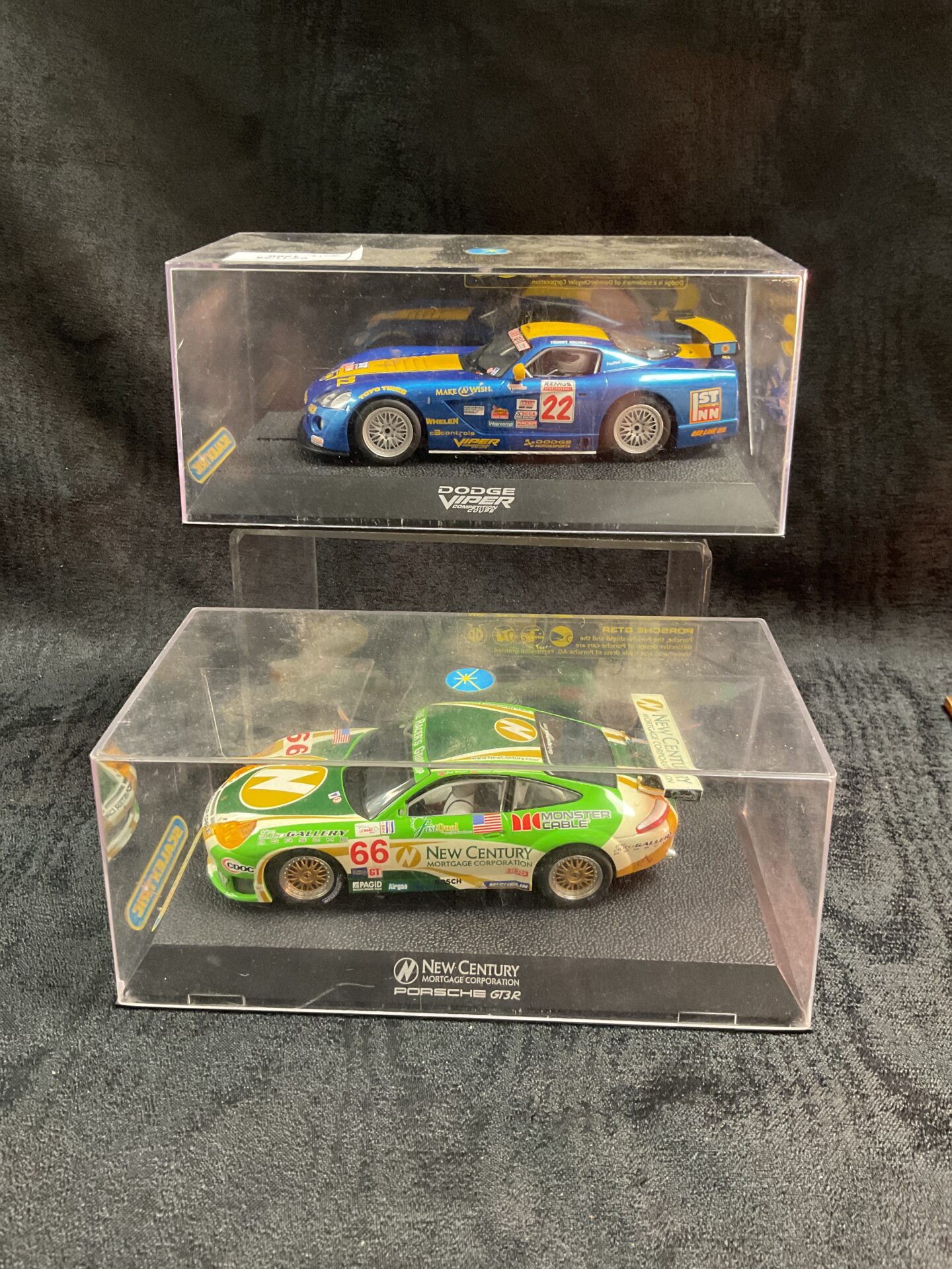 This lot features a Scalextric racing set comprising a Dodge Viper and a Porsche GT3R. These are classic slot car models designed for the popular Scalextric racing system. The set includes both vehicles, offering enthusiasts the chance to recreate thrilling races from the comfort of their home.