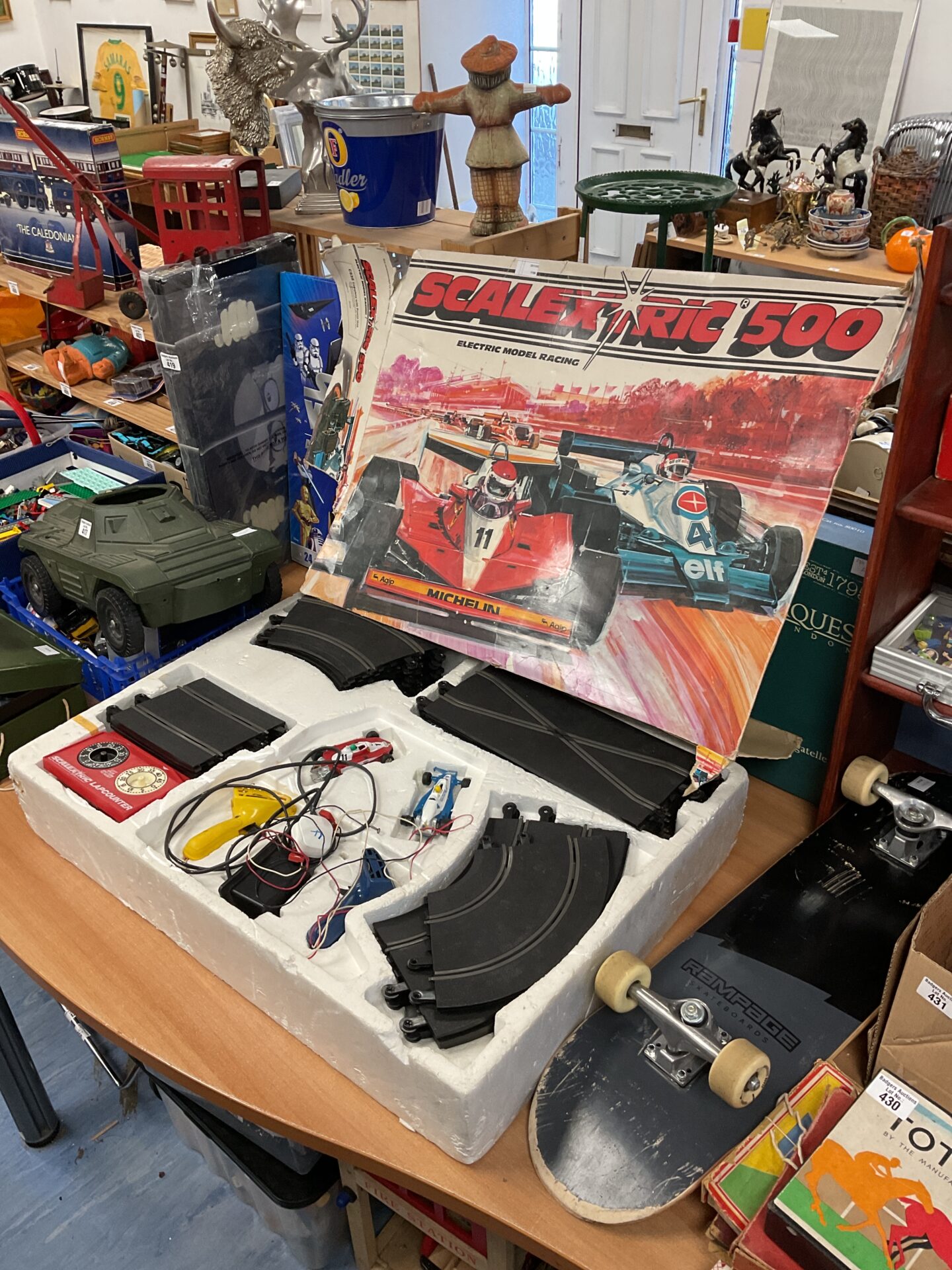 This is a Scalextric 500 Formula One racing set, a classic toy from a bygone era. The set includes two formula one style cars, a track, and hand controllers, designed to provide hours of racing fun. The vibrant colours and detailed design of the cars and track reflect the excitement of Formula One racing, making it a visually appealing and engaging toy for enthusiasts of all ages.
